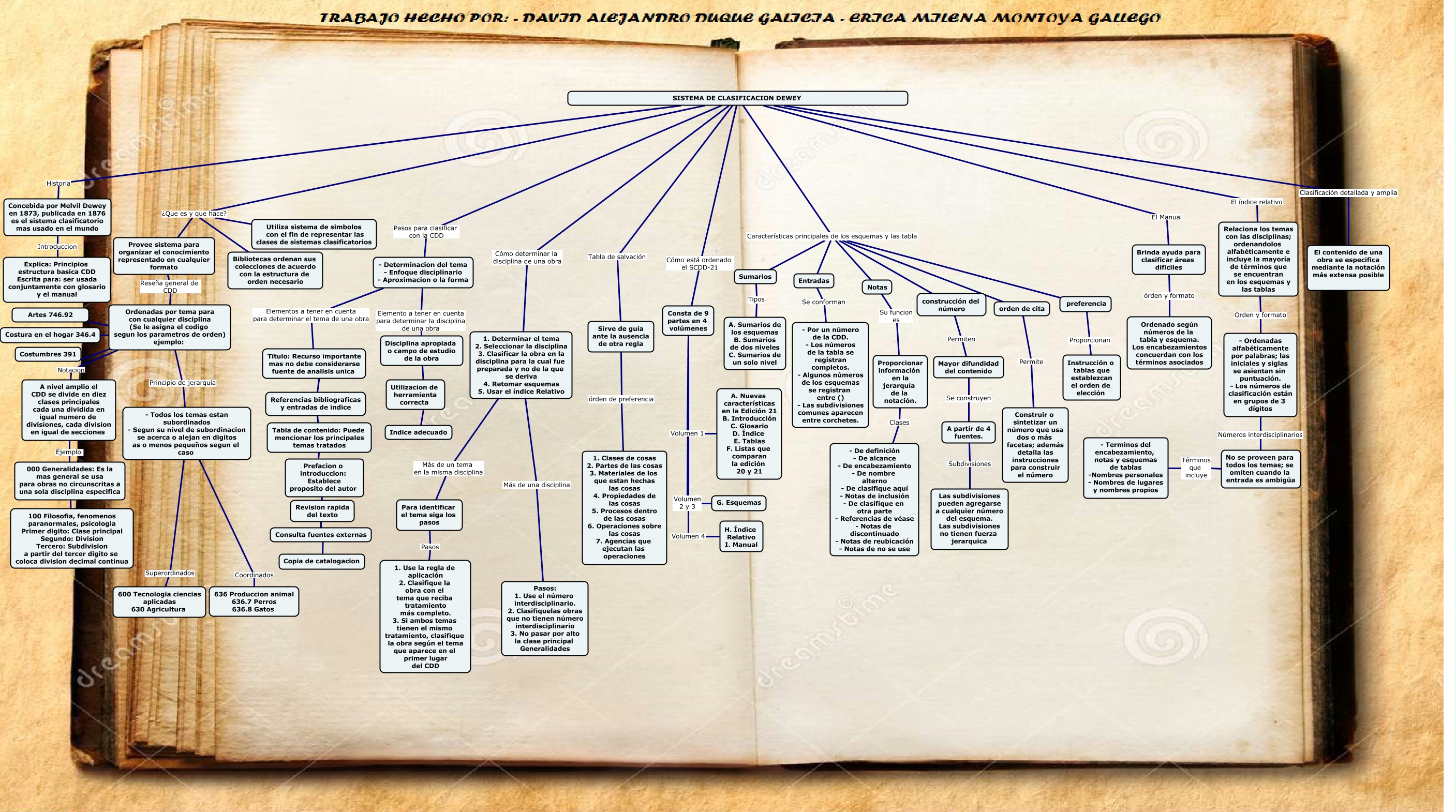 Este Cmap, tiene información relacionada con: Trabajo colaborativo. Dewey, Sirve de guía ante la ausencia de otra regla órden de preferencia 1. Clases de cosas 2. Partes de las cosas 3. Materiales de los que estan hechas las cosas 4. Propiedades de las cosas 5. Procesos dentro de las cosas 6. Operaciones sobre las cosas 7. Agencias que ejecutan las operaciones, - Todos los temas estan subordinados - Segun su nivel de subordinacion se acerca o alejan en digitos as o menos pequeños segun el caso Superordinados 600 Tecnologia ciencias aplicadas 630 Agricultura, A nivel amplio el CDD se divide en diez clases principales cada una dividida en igual numero de divisiones, cada division en igual de secciones Ejemplo 000 Generalidades: Es la mas general se usa para obras no circunscritas a una sola disciplina especifica, Ordenadas por tema para con cualquier disciplina (Se le asigna el codigo segun los parametros de orden) ejemplo: Notacion A nivel amplio el CDD se divide en diez clases principales cada una dividida en igual numero de divisiones, cada division en igual de secciones, - Determinacion del tema - Enfoque disciplinario - Aproximacion o la forma Pasos para clasificar con la CDD SISTEMA DE CLASIFICACION DEWEY, Prefacion o introduccion: Establece proposito del autor ???? Revision rapida del texto, SISTEMA DE CLASIFICACION DEWEY Historia Concebida por Melvil Dewey en 1873, publicada en 1876 es el sistema clasificatorio mas usado en el mundo, Ordenadas por tema para con cualquier disciplina (Se le asigna el codigo segun los parametros de orden) ejemplo: Principio de jerarquia - Todos los temas estan subordinados - Segun su nivel de subordinacion se acerca o alejan en digitos as o menos pequeños segun el caso, SISTEMA DE CLASIFICACION DEWEY Características principales de los esquemas y las tabla construcción del número, SISTEMA DE CLASIFICACION DEWEY Características principales de los esquemas y las tabla Sumarios, Consulta fuentes externas ???? Copia de catalogacion, Sumarios Tipos A. Sumarios de los esquemas B. Sumarios de dos niveles C. Sumarios de un solo nivel, - Ordenadas alfabéticamente por palabras; las iniciales y siglas se asientan sin puntuación. - Los números de clasificación están en grupos de 3 dígitos Números interdisciplinarios No se proveen para todos los temas; se omiten cuando la entrada es ambigüa, Disciplina apropiada o campo de estudio de la obra ???? Utilizacion de herramienta correcta, Consta de 9 partes en 4 volúmenes Volumen 4 H. Índice Relativo I. Manual, SISTEMA DE CLASIFICACION DEWEY El Manual Brinda ayuda para clasificar áreas dificiles, SISTEMA DE CLASIFICACION DEWEY Cómo está ordenado el SCDD-21 Consta de 9 partes en 4 volúmenes, 1. Determinar el tema 2. Seleccionar la disciplina 3. Clasificar la obra en la disciplina para la cual fue preparada y no de la que se deriva 4. Retomar esquemas 5. Usar el índice Relativo Más de un tema en la misma disciplina Para identificar el tema siga los pasos, Ordenadas por tema para con cualquier disciplina (Se le asigna el codigo segun los parametros de orden) ejemplo: ???? Artes 746.92, Brinda ayuda para clasificar áreas dificiles órden y formato Ordenado según números de la tabla y esquema. Los encabezamientos concuerdan con los términos asociados