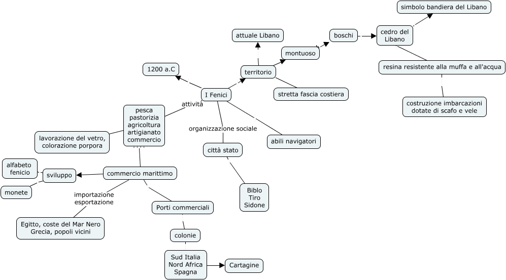 Questa Cmap, creata con IHMC CmapTools, contiene informazioni relative a: Fenici, Porti commerciali colonie, territorio montuoso, Sud Italia Nord Africa Spagna Cartagine, pesca pastorizia agricoltura artigianato commercio ???? commercio marittimo, I Fenici abili navigatori, cedro del Libano resina resistente alla muffa e all'acqua, territorio stretta fascia costiera, montuoso b boschi, pesca pastorizia agricoltura artigianato commercio lavorazione del vetro, colorazione porpora, città stato Biblo Tiro Sidone, I Fenici 1200 a.C, territorio attuale Libano, boschi cedro del Libano, cedro del Libano simbolo bandiera del Libano, commercio marittimo sviluppo, colonie Sud Italia Nord Africa Spagna, sviluppo alfabeto fenicio, I Fenici organizzazione sociale città stato, commercio marittimo Porti commerciali, resina resistente alla muffa e all'acqua costruzione imbarcazioni dotate di scafo e vele