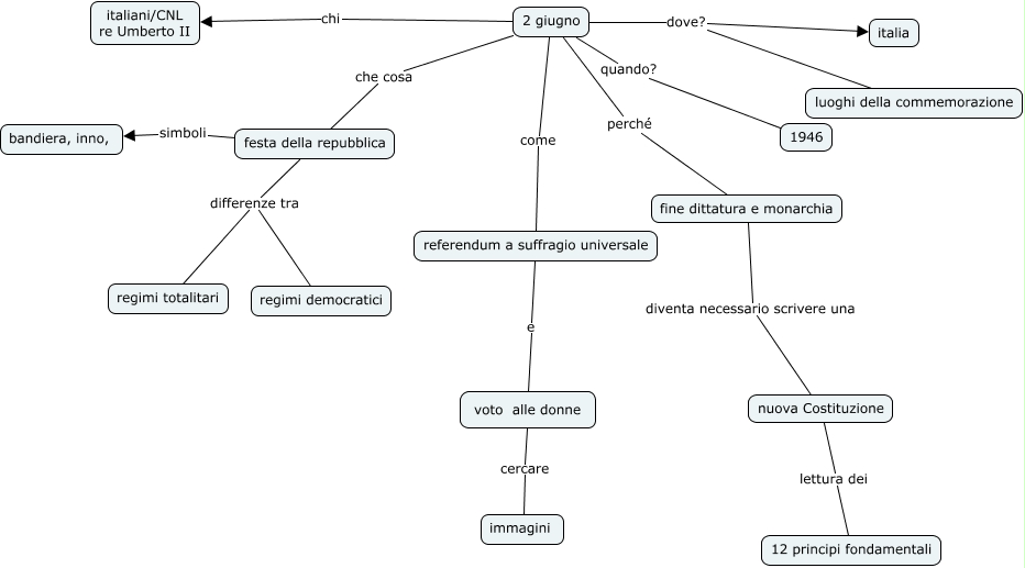 Questa Cmap, creata con IHMC CmapTools, contiene informazioni relative a: 2 giugno alunni, voto alle donne cercare immagini, 2 giugno chi italiani/CNL re Umberto II, nuova Costituzione lettura dei 12 principi fondamentali, fine dittatura e monarchia diventa necessario scrivere una nuova Costituzione, 2 giugno come referendum a suffragio universale, 2 giugno quando? 1946, 2 giugno che cosa festa della repubblica, festa della repubblica simboli bandiera, inno,, festa della repubblica differenze tra regimi democratici, festa della repubblica differenze tra regimi totalitari, 2 giugno dove? luoghi della commemorazione, 2 giugno dove? italia, referendum a suffragio universale e voto alle donne, 2 giugno perché fine dittatura e monarchia