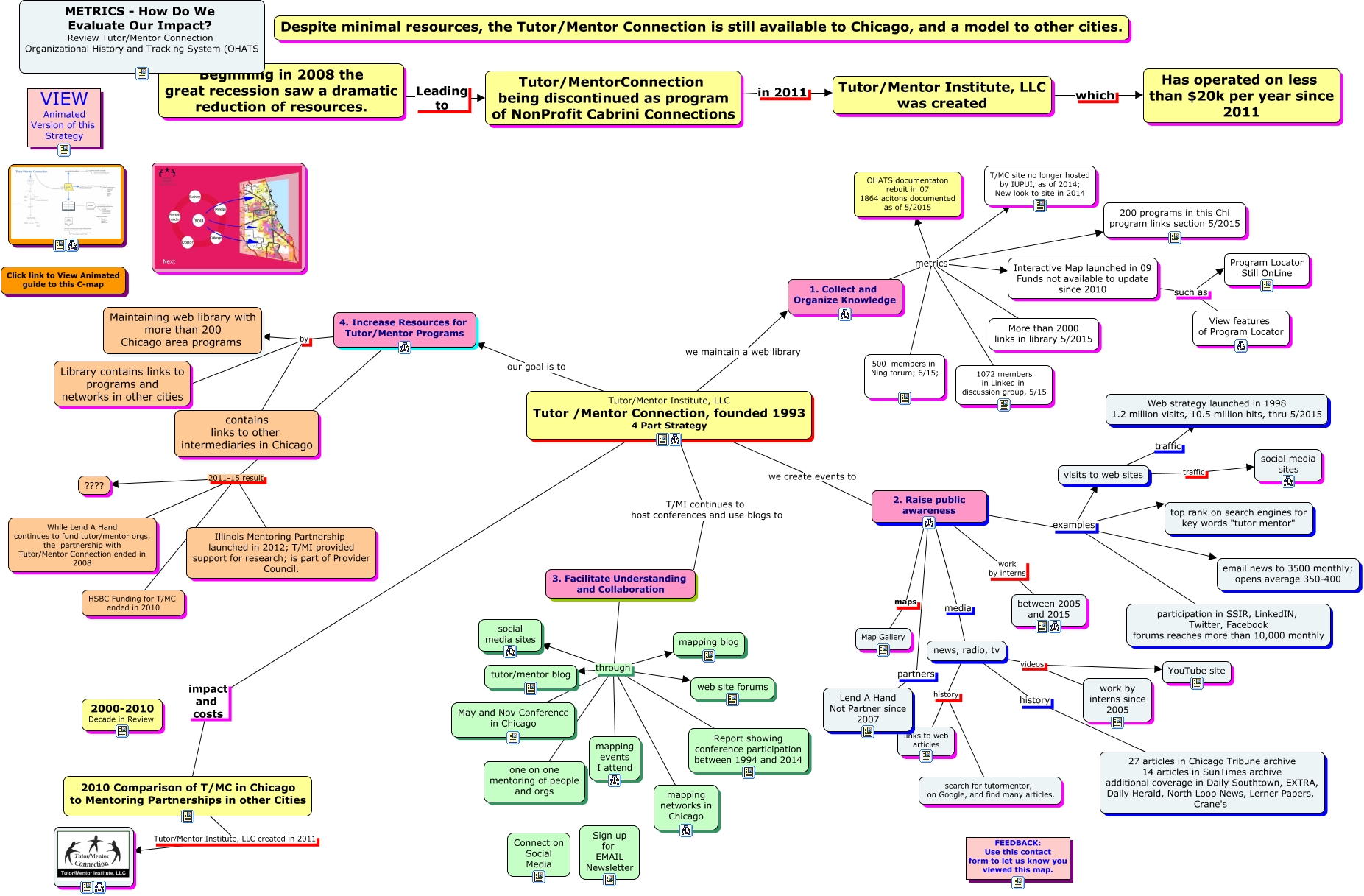 This Concept Map, created with IHMC CmapTools, has information related to: metrics-2015update, 1. Collect and Organize Knowledge metrics 200 programs in this Chi program links section 5/2015, 4. Increase Resources for Tutor/Mentor Programs 2011-15 result While Lend A Hand continues to fund tutor/mentor orgs, the partnership with Tutor/Mentor Connection ended in 2008, Interactive Map launched in 09 Funds not available to update since 2010 such as Program Locator Still OnLine, 3. Facilitate Understanding and Collaboration through Report showing conference participation between 1994 and 2014, 1. Collect and Organize Knowledge metrics 1072 members in Linked in discussion group, 5/15, 3. Facilitate Understanding and Collaboration through social media sites, 1. Collect and Organize Knowledge metrics More than 2000 links in library 5/2015, 2. Raise public awareness partners Lend A Hand Not Partner since 2007, news, radio, tv videos YouTube site, 4. Increase Resources for Tutor/Mentor Programs 2011-15 result ????, news, radio, tv history links to web articles, news, radio, tv history search for tutormentor, on Google, and find many articles., 3. Facilitate Understanding and Collaboration through tutor/mentor blog, 2. Raise public awareness examples visits to web sites, 1. Collect and Organize Knowledge metrics 500 members in Ning forum; 6/15;, 4. Increase Resources for Tutor/Mentor Programs by Maintaining web library with more than 200 Chicago area programs, Interactive Map launched in 09 Funds not available to update since 2010 such as View features of Program Locator, Tutor/MentorConnection being discontinued as program of NonProfit Cabrini Connections in 2011 Tutor/Mentor Institute, LLC was created, 1. Collect and Organize Knowledge metrics OHATS documentaton rebuit in 07 1864 acitons documented as of 5/2015, Tutor/Mentor Institute, LLC Tutor /Mentor Connection, founded 1993 4 Part Strategy impact and costs 2010 Comparison of T/MC in Chicago to Mentoring Partnerships in other Cities