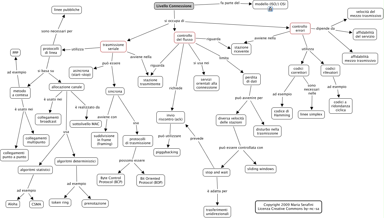 Questa Cmap, creata con IHMC CmapTools, contiene informazioni relative a: LivelloDataLink, allocazione canale usa algoritmi statistici, protocolli di linea sono necessari per linee pubbliche, trasmissione seriale può essere sincrona, Livello Connessione si occupa di controllo del flusso, controllo errori utilizza codici rilevatori, invio riscontro (ack) può utilizzare piggybacking, protocolli di trasmissione possono essere Byte Control Protocol (BCP), stop and wait prevede invio riscontro (ack), allocazione canale usa algoritmi deterministici, allocazione canale è realizzato da sottolivello MAC, Livello Connessione si occupa di trasmissione seriale, trasmissione seriale avviene nella stazione trasmittente, controllo errori avviene nella stazione ricevente, perdita di dati può avvenire per diversa velocità delle stazioni, algoritmi deterministici ad esempio token ring, protocolli di linea si basa su metodo a contesa, codici correttori sono necessari nelle linee simplex, codici correttori ad esempio codice di Hamming, diversa velocità delle stazioni può essere controllata con sliding windows, protocolli di linea si basa su allocazione canale