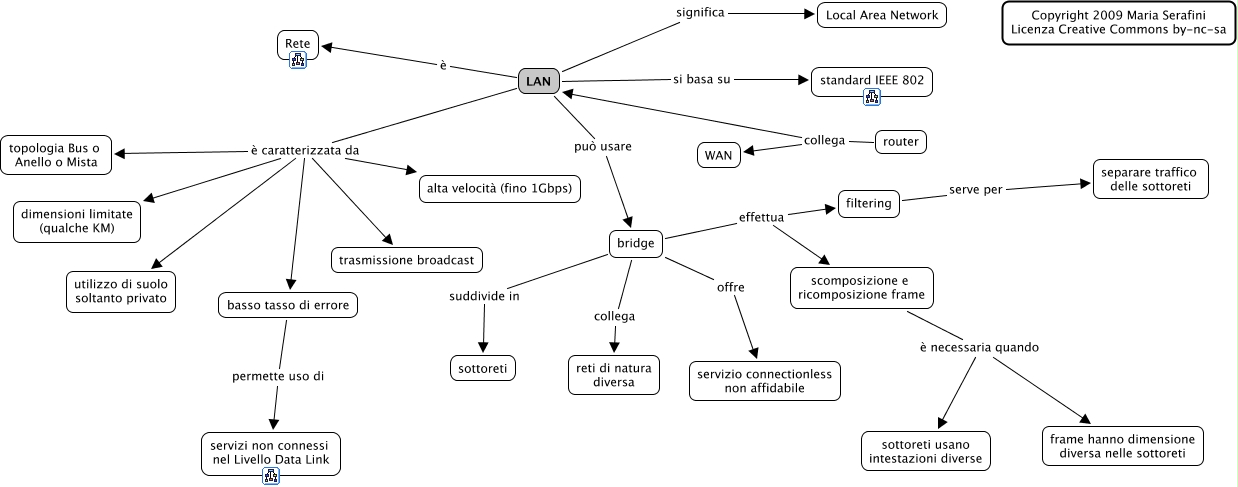 Questa Cmap, creata con IHMC CmapTools, contiene informazioni relative a: LAN, LAN è caratterizzata da trasmissione broadcast, LAN è caratterizzata da utilizzo di suolo soltanto privato, filtering serve per separare traffico delle sottoreti, bridge collega reti di natura diversa, bridge effettua filtering, scomposizione e ricomposizione frame è necessaria quando frame hanno dimensione diversa nelle sottoreti, LAN significa Local Area Network, router collega WAN, bridge suddivide in sottoreti, LAN è Rete, LAN è caratterizzata da dimensioni limitate (qualche KM), LAN si basa su standard IEEE 802, LAN è caratterizzata da topologia Bus o Anello o Mista, LAN è caratterizzata da alta velocità (fino 1Gbps), LAN può usare bridge, scomposizione e ricomposizione frame è necessaria quando sottoreti usano intestazioni diverse, LAN è caratterizzata da basso tasso di errore, bridge effettua scomposizione e ricomposizione frame, bridge offre servizio connectionless non affidabile, basso tasso di errore permette uso di servizi non connessi nel Livello Data Link