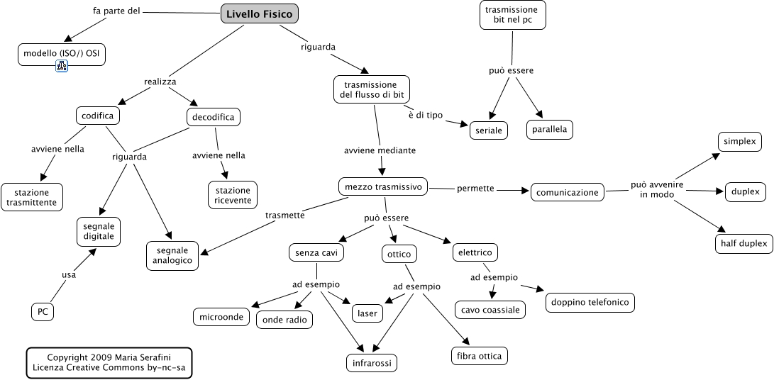 Questa Cmap, creata con IHMC CmapTools, contiene informazioni relative a: LivelloFisico, elettrico ad esempio cavo coassiale, decodifica avviene nella stazione ricevente, senza cavi ad esempio microonde, mezzo trasmissivo può essere elettrico, codifica avviene nella stazione trasmittente, decodifica riguarda segnale digitale, Livello Fisico fa parte del modello (ISO/) OSI, ottico ad esempio laser, trasmissione bit nel pc può essere seriale, mezzo trasmissivo permette comunicazione, mezzo trasmissivo può essere ottico, senza cavi ad esempio laser, senza cavi ad esempio onde radio, Livello Fisico realizza codifica, senza cavi ad esempio infrarossi, Livello Fisico riguarda trasmissione del flusso di bit, ottico ad esempio infrarossi, trasmissione bit nel pc può essere parallela, mezzo trasmissivo può essere senza cavi, comunicazione può avvenire in modo simplex