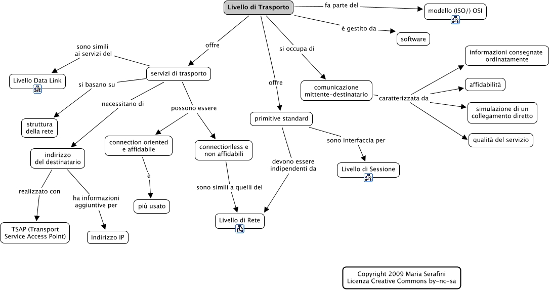 Questa Cmap, creata con IHMC CmapTools, contiene informazioni relative a: LivelloTrasporto, Livello di Trasporto fa parte del modello (ISO/) OSI, servizi di trasporto sono simili ai servizi del Livello Data Link, indirizzo del destinatario realizzato con TSAP (Transport Service Access Point), comunicazione mittente-destinatario caratterizzata da qualità del servizio, primitive standard devono essere indipendenti da Livello di Rete, Livello di Trasporto offre servizi di trasporto, servizi di trasporto necessitano di indirizzo del destinatario, Livello di Trasporto è gestito da software, indirizzo del destinatario ha informazioni aggiuntive per Indirizzo IP, primitive standard sono interfaccia per Livello di Sessione, connection oriented e affidabile è più usato, comunicazione mittente-destinatario caratterizzata da simulazione di un collegamento diretto, servizi di trasporto si basano su struttura della rete, Livello di Trasporto offre primitive standard, servizi di trasporto possono essere connectionless e non affidabili, servizi di trasporto possono essere connection oriented e affidabile, connectionless e non affidabili sono simili a quelli del Livello di Rete, Livello di Trasporto si occupa di comunicazione mittente-destinatario, comunicazione mittente-destinatario caratterizzata da affidabilità, comunicazione mittente-destinatario caratterizzata da informazioni consegnate ordinatamente