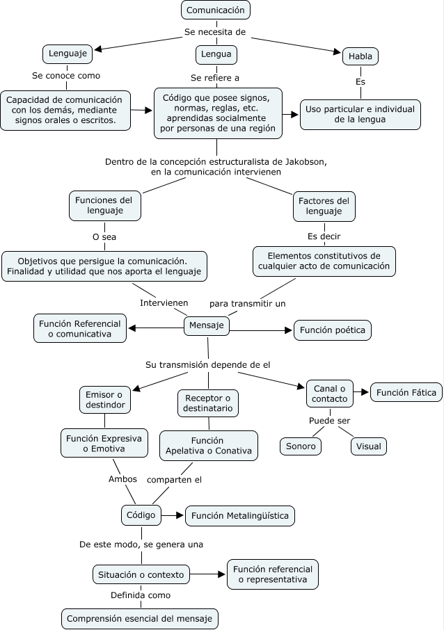 Este Cmap, tiene información relacionada con: 2. Factores y funciones del lenguaje, Emisor o destindor ???? Función Expresiva o Emotiva, Objetivos que persigue la comunicación. Finalidad y utilidad que nos aporta el lenguaje Intervienen Mensaje, Dentro de la concepción estructuralista de Jakobson, en la comunicación intervienen Factores del lenguaje, Código De este modo, se genera una Situación o contexto, Código que posee signos, normas, reglas, etc. aprendidas socialmente por personas de una región ???? Uso particular e individual de la lengua, Funciones del lenguaje O sea Objetivos que persigue la comunicación. Finalidad y utilidad que nos aporta el lenguaje, Mensaje Su transmisión depende de el Emisor o destindor, Dentro de la concepción estructuralista de Jakobson, en la comunicación intervienen Funciones del lenguaje, Situación o contexto ???? Función referencial o representativa, Lenguaje Se conoce como Capacidad de comunicación con los demás, mediante signos orales o escritos., Factores del lenguaje Es decir Elementos constitutivos de cualquier acto de comunicación, Situación o contexto Definida como Comprensión esencial del mensaje, Capacidad de comunicación con los demás, mediante signos orales o escritos. ???? Código que posee signos, normas, reglas, etc. aprendidas socialmente por personas de una región, Receptor o destinatario ???? Función Apelativa o Conativa, Elementos constitutivos de cualquier acto de comunicación para transmitir un Mensaje, Canal o contacto ???? Función Fática, Comunicación Se necesita de Habla, Mensaje Su transmisión depende de el Receptor o destinatario, Canal o contacto Puede ser Visual, Canal o contacto Puede ser Sonoro