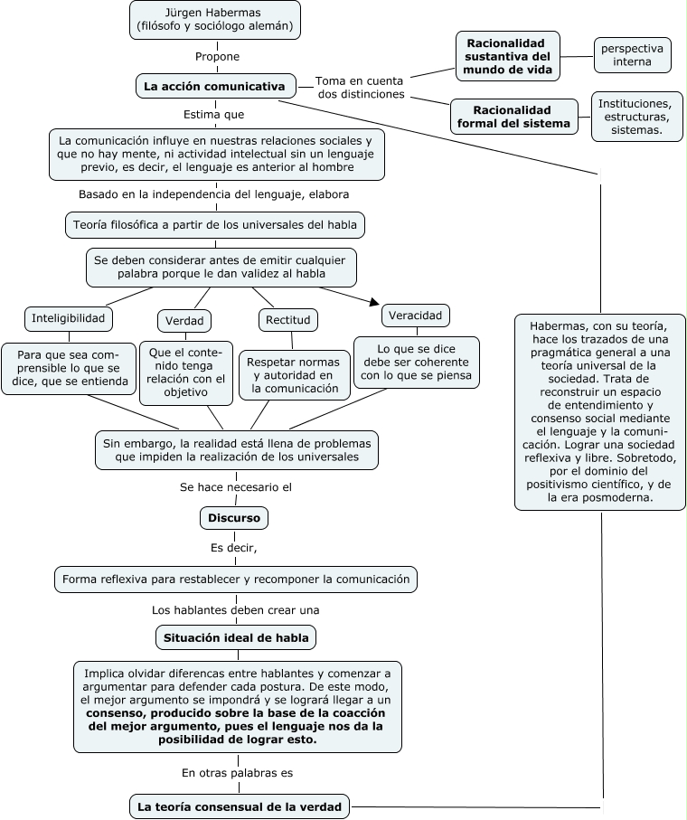 Este Cmap, tiene información relacionada con: 4. La acción comunicativa, Para que sea com- prensible lo que se dice, que se entienda ???? Sin embargo, la realidad está llena de problemas que impiden la realización de los universales, La acción comunicativa Habermas, con su teoría, hace los trazados de una pragmática general a una teoría universal de la sociedad. Trata de reconstruir un espacio de entendimiento y consenso social mediante el lenguaje y la comuni- cación. Lograr una sociedad reflexiva y libre. Sobretodo, por el dominio del positivismo científico, y de la era posmoderna., La acción comunicativa Toma en cuenta dos distinciones Racionalidad formal del sistema, Racionalidad sustantiva del mundo de vida ???? perspectiva interna, La acción comunicativa Estima que La comunicación influye en nuestras relaciones sociales y que no hay mente, ni actividad intelectual sin un lenguaje previo, es decir, el lenguaje es anterior al hombre, Veracidad ???? Lo que se dice debe ser coherente con lo que se piensa, La acción comunicativa Habermas, con su teoría, hace los trazados de una pragmática general a una teoría universal de la sociedad. Trata de reconstruir un espacio de entendimiento y consenso social mediante el lenguaje y la comuni- cación. Lograr una sociedad reflexiva y libre. Sobretodo, por el dominio del positivismo científico, y de la era posmoderna., La acción comunicativa Toma en cuenta dos distinciones Racionalidad sustantiva del mundo de vida, Inteligibilidad ???? Para que sea com- prensible lo que se dice, que se entienda, Situación ideal de habla ???? Implica olvidar diferencas entre hablantes y comenzar a argumentar para defender cada postura. De este modo, el mejor argumento se impondrá y se logrará llegar a un consenso, producido sobre la base de la coacción del mejor argumento, pues el lenguaje nos da la posibilidad de lograr esto., Lo que se dice debe ser coherente con lo que se piensa ???? Sin embargo, la realidad está llena de problemas que impiden la realización de los universales, Implica olvidar diferencas entre hablantes y comenzar a argumentar para defender cada postura. De este modo, el mejor argumento se impondrá y se logrará llegar a un consenso, producido sobre la base de la coacción del mejor argumento, pues el lenguaje nos da la posibilidad de lograr esto. En otras palabras es La teoría consensual de la verdad, Que el conte- nido tenga relación con el objetivo ???? Sin embargo, la realidad está llena de problemas que impiden la realización de los universales, Forma reflexiva para restablecer y recomponer la comunicación Los hablantes deben crear una Situación ideal de habla, Se deben considerar antes de emitir cualquier palabra porque le dan validez al habla ???? Inteligibilidad, Sin embargo, la realidad está llena de problemas que impiden la realización de los universales Se hace necesario el Discurso, Respetar normas y autoridad en la comunicación ???? Sin embargo, la realidad está llena de problemas que impiden la realización de los universales, Se deben considerar antes de emitir cualquier palabra porque le dan validez al habla ???? Verdad, Racionalidad formal del sistema ???? Instituciones, estructuras, sistemas., Se deben considerar antes de emitir cualquier palabra porque le dan validez al habla ???? Veracidad