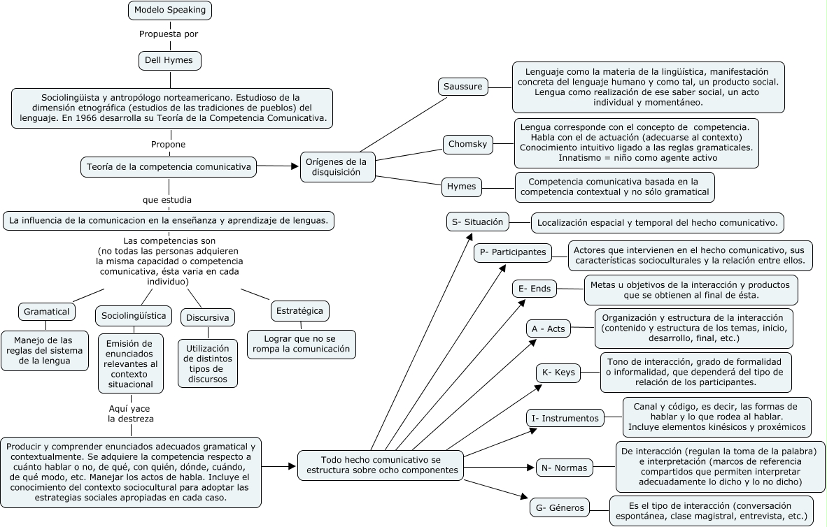 Este Cmap, tiene información relacionada con: 6. La competencia comunicativa, Sociolingüista y antropólogo norteamericano. Estudioso de la dimensión etnográfica (estudios de las tradiciones de pueblos) del lenguaje. En 1966 desarrolla su Teoría de la Competencia Comunicativa. Propone Teoría de la competencia comunicativa, Teoría de la competencia comunicativa ???? Orígenes de la disquisición, Dell Hymes ???? Sociolingüista y antropólogo norteamericano. Estudioso de la dimensión etnográfica (estudios de las tradiciones de pueblos) del lenguaje. En 1966 desarrolla su Teoría de la Competencia Comunicativa., A - Acts ???? Organización y estructura de la interacción (contenido y estructura de los temas, inicio, desarrollo, final, etc.), Todo hecho comunicativo se estructura sobre ocho componentes ???? G- Géneros, Producir y comprender enunciados adecuados gramatical y contextualmente. Se adquiere la competencia respecto a cuánto hablar o no, de qué, con quién, dónde, cuándo, de qué modo, etc. Manejar los actos de habla. Incluye el conocimiento del contexto sociocultural para adoptar las estrategias sociales apropiadas en cada caso. ???? Todo hecho comunicativo se estructura sobre ocho componentes, Todo hecho comunicativo se estructura sobre ocho componentes ???? S- Situación, Todo hecho comunicativo se estructura sobre ocho componentes ???? N- Normas, Chomsky ???? Lengua corresponde con el concepto de competencia. Habla con el de actuación (adecuarse al contexto) Conocimiento intuitivo ligado a las reglas gramaticales. Innatismo = niño como agente activo, Modelo Speaking Propuesta por Dell Hymes, Discursiva ???? Utilización de distintos tipos de discursos, N- Normas ???? De interacción (regulan la toma de la palabra) e interpretación (marcos de referencia compartidos que permiten interpretar adecuadamente lo dicho y lo no dicho), La influencia de la comunicacion en la enseñanza y aprendizaje de lenguas. Las competencias son (no todas las personas adquieren la misma capacidad o competencia comunicativa, ésta varia en cada individuo) Estratégica, G- Géneros ???? Es el tipo de interacción (conversación espontánea, clase magistral, entrevista, etc.), Todo hecho comunicativo se estructura sobre ocho componentes ???? P- Participantes, S- Situación ???? Localización espacial y temporal del hecho comunicativo., I- Instrumentos ???? Canal y código, es decir, las formas de hablar y lo que rodea al hablar. Incluye elementos kinésicos y proxémicos, La influencia de la comunicacion en la enseñanza y aprendizaje de lenguas. Las competencias son (no todas las personas adquieren la misma capacidad o competencia comunicativa, ésta varia en cada individuo) Discursiva, P- Participantes ???? Actores que intervienen en el hecho comunicativo, sus características socioculturales y la relación entre ellos., Orígenes de la disquisición ???? Hymes