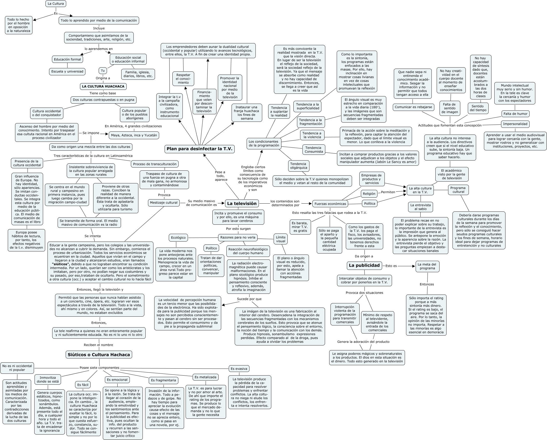 Este Cmap, tiene información relacionada con: Cultura Huachaca, Cultura occidental o del conquistador ???? Ascenso del hombre por medio del conocimiento. Intento por traspasar esa cultuta racional en América en el proceso civilizador, Plan para desinfectar la T.V. ???? Respetar el conoci- miento, Los condicionantes de la programación ???? Tendencia Consumista, La publicidad Esto es La meta del programa, Traspaso de cultura de una fuerza en pugna a otra de mala gana, no armoniosa y contaminándose Provoca Mestizaje cultural, Educación formal ???? Escuela y universiad, Da como origen una mezcla entre las dos culturas Tres características de la cultura en Latinoamérica Insistente sobreviviencia de la cultura popular arraigada en las zonas rurales, Incita y promueve el consumo y por ello, es una máquina para lavar cerebros Por esto surgen Razones para no verla, La radiación electro- magnética puede causar malformaciones. En el plano sicológico produce hipnósis. Inhibe el pensamiento consciente y reflexivo, además, atrofia la imaginación Sucede por que La velocidad de percepción humana es un tercio menor que las posibilida- des de la electrónica. Ha sido explota- da para la publicidad porque los men- sajes no son percibidos conscientemen- te y pasan al cerebro sin ser procesa- dos. Esto permite el consumismo y da pie a la propaganda subliminal, La meta del programa Entonces Sólo importa el rating porque a más sintonía más dinero. Si el rating es bajo, el programa se saca del aire. Por lo tanto, la opinión de las minorías no importa. Respetar a las minorías es algo esencial en demoracia, Inataurar una franja huachaca los fines de semana ???? Los emprendedores deben aunar la dualidad cultural (occidental y popular) utilizando lo avances tecnológicos, entre ellos, la T.V. A fin de crear una identidad propia., Respetar el conoci- miento ???? Los emprendedores deben aunar la dualidad cultural (occidental y popular) utilizando lo avances tecnológicos, entre ellos, la T.V. A fin de crear una identidad propia., Es fragmentaria ???? Invasión de la infor- mación. Todo a pe- dazos y de golpe. No hay tiempo para apreciar la evolución causa-efecto de las cosas y el mensaje no se aprecia entero, como si pasa en una novela, por ej., Da como origen una mezcla entre las dos culturas Tres características de la cultura en Latinoamérica Presencia de la cultura occidental, Sentido del tiempo ???? No hay capacidad de síntesis dado que, docentes están acostum- brados a las dos horas de clases, Reacción neurofisiológico del cuerpo humano ???? La radiación electro- magnética puede causar malformaciones. En el plano sicológico produce hipnósis. Inhibe el pensamiento consciente y reflexivo, además, atrofia la imaginación, La alta cultura no interesa a la audiencia. Los directivos creen que si el nivel educativo sube, la sintonía baja. Un programa educativo hay que saber hacerlo. Actitudes que fomentan esta concepción Comunicar es rebajarse, Político ???? Tratan de dar orientaciones políticas, convencer, manipular, La alta cultura no interesa a la audiencia. Los directivos creen que si el nivel educativo sube, la sintonía baja. Un programa educativo hay que saber hacerlo. Actitudes que fomentan esta concepción Impersonalidad, Intercalar objetos de consumo y cobrar por ponerlos en la T.V. Provoca dos situaciones Interrupción violenta de la programación para transmitir comercales