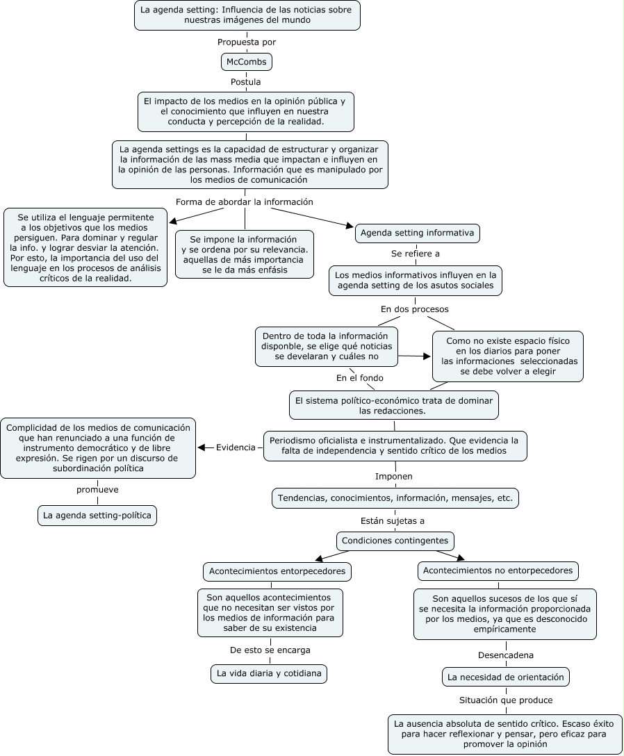 Este Cmap, tiene información relacionada con: 7. Agenda-Setting, Dentro de toda la información disponble, se elige qué noticias se develaran y cuáles no En el fondo El sistema político-económico trata de dominar las redacciones., Condiciones contingentes ???? Acontecimientos no entorpecedores, Son aquellos acontecimientos que no necesitan ser vistos por los medios de información para saber de su existencia De esto se encarga La vida diaria y cotidiana, La agenda setting: Influencia de las noticias sobre nuestras imágenes del mundo Propuesta por McCombs, Condiciones contingentes ???? Acontecimientos entorpecedores, La necesidad de orientación Situación que produce La ausencia absoluta de sentido crítico. Escaso éxito para hacer reflexionar y pensar, pero eficaz para promover la opinión, Dentro de toda la información disponble, se elige qué noticias se develaran y cuáles no ???? Como no existe espacio físico en los diarios para poner las informaciones seleccionadas se debe volver a elegir, Complicidad de los medios de comunicación que han renunciado a una función de instrumento democrático y de libre expresión. Se rigen por un discurso de subordinación política promueve La agenda setting-política, Los medios informativos influyen en la agenda setting de los asutos sociales En dos procesos Dentro de toda la información disponble, se elige qué noticias se develaran y cuáles no, El sistema político-económico trata de dominar las redacciones. Imponen Tendencias, conocimientos, información, mensajes, etc., Agenda setting informativa Se refiere a Los medios informativos influyen en la agenda setting de los asutos sociales, Acontecimientos no entorpecedores ???? Son aquellos sucesos de los que sí se necesita la información proporcionada por los medios, ya que es desconocido empíricamente, Los medios informativos influyen en la agenda setting de los asutos sociales En dos procesos Como no existe espacio físico en los diarios para poner las informaciones seleccionadas se debe volver a elegir, Como no existe espacio físico en los diarios para poner las informaciones seleccionadas se debe volver a elegir ???? El sistema político-económico trata de dominar las redacciones., McCombs Postula El impacto de los medios en la opinión pública y el conocimiento que influyen en nuestra conducta y percepción de la realidad., Acontecimientos entorpecedores ???? Son aquellos acontecimientos que no necesitan ser vistos por los medios de información para saber de su existencia, Periodismo oficialista e instrumentalizado. Que evidencia la falta de independencia y sentido crítico de los medios Evidencia Complicidad de los medios de comunicación que han renunciado a una función de instrumento democrático y de libre expresión. Se rigen por un discurso de subordinación política, El impacto de los medios en la opinión pública y el conocimiento que influyen en nuestra conducta y percepción de la realidad. Forma de abordar la información Agenda setting informativa, Son aquellos sucesos de los que sí se necesita la información proporcionada por los medios, ya que es desconocido empíricamente Desencadena La necesidad de orientación, Tendencias, conocimientos, información, mensajes, etc. Están sujetas a Condiciones contingentes