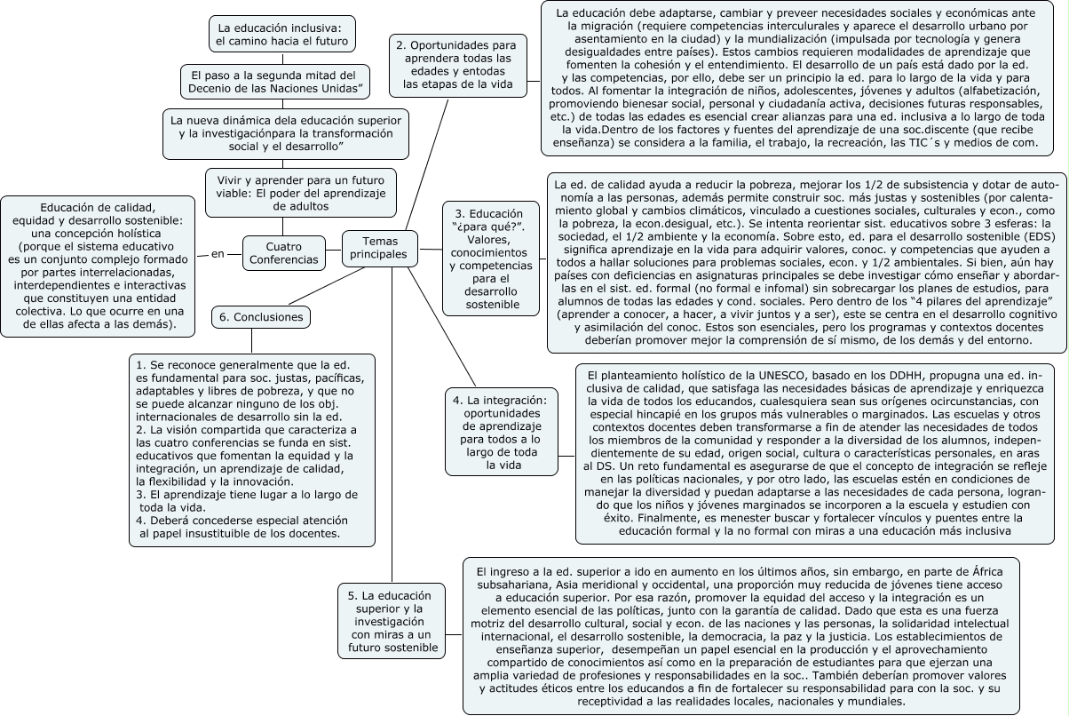 Este Cmap, tiene información relacionada con: UNESCO, Temas principales ???? 4. La integración: oportunidades de aprendizaje para todos a lo largo de toda la vida, Cuatro Conferencias en Educación de calidad, equidad y desarrollo sostenible: una concepción holística (porque el sistema educativo es un conjunto complejo formado por partes interrelacionadas, interdependientes e interactivas que constituyen una entidad colectiva. Lo que ocurre en una de ellas afecta a las demás)., Cuatro Conferencias ???? La educación inclusiva: el camino hacia el futuro, 6. Conclusiones ???? 1. Se reconoce generalmente que la ed. es fundamental para soc. justas, pacíficas, adaptables y libres de pobreza, y que no se puede alcanzar ninguno de los obj. internacionales de desarrollo sin la ed. 2. La visión compartida que caracteriza a las cuatro conferencias se funda en sist. educativos que fomentan la equidad y la integración, un aprendizaje de calidad, la flexibilidad y la innovación. 3. El aprendizaje tiene lugar a lo largo de toda la vida. 4. Deberá concederse especial atención al papel insustituible de los docentes., Cuatro Conferencias ???? Temas principales, Temas principales ???? 3. Educación “¿para qué?”. Valores, conocimientos y competencias para el desarrollo sostenible, 2. Oportunidades para aprendera todas las edades y entodas las etapas de la vida ???? La educación debe adaptarse, cambiar y preveer necesidades sociales y económicas ante la migración (requiere competencias interculurales y aparece el desarrollo urbano por asentamiento en la ciudad) y la mundialización (impulsada por tecnología y genera desigualdades entre países). Estos cambios requieren modalidades de aprendizaje que fomenten la cohesión y el entendimiento. El desarrollo de un país está dado por la ed. y las competencias, por ello, debe ser un principio la ed. para lo largo de la vida y para todos. Al fomentar la integración de niños, adolescentes, jóvenes y adultos (alfabetización, promoviendo bienesar social, personal y ciudadanía activa, decisiones futuras responsables, etc.) de todas las edades es esencial crear alianzas para una ed. inclusiva a lo largo de toda la vida.Dentro de los factores y fuentes del aprendizaje de una soc.discente (que recibe enseñanza) se considera a la familia, el trabajo, la recreación, las TIC´s y medios de com., Temas principales ???? 5. La educación superior y la investigación con miras a un futuro sostenible, Temas principales ???? 6. Conclusiones, 4. La integración: oportunidades de aprendizaje para todos a lo largo de toda la vida ???? El planteamiento holístico de la UNESCO, basado en los DDHH, propugna una ed. in- clusiva de calidad, que satisfaga las necesidades básicas de aprendizaje y enriquezca la vida de todos los educandos, cualesquiera sean sus orígenes ocircunstancias, con especial hincapié en los grupos más vulnerables o marginados. Las escuelas y otros contextos docentes deben transformarse a fin de atender las necesidades de todos los miembros de la comunidad y responder a la diversidad de los alumnos, indepen- dientemente de su edad, origen social, cultura o características personales, en aras al DS. Un reto fundamental es asegurarse de que el concepto de integración se refleje en las políticas nacionales, y por otro lado, las escuelas estén en condiciones de manejar la diversidad y puedan adaptarse a las necesidades de cada persona, logran- do que los niños y jóvenes marginados se incorporen a la escuela y estudien con éxito. Finalmente, es menester buscar y fortalecer vínculos y puentes entre la educación formal y la no formal con miras a una educación más inclusiva, 5. La educación superior y la investigación con miras a un futuro sostenible ???? El ingreso a la ed. superior a ido en aumento en los últimos años, sin embargo, en parte de África subsahariana, Asia meridional y occidental, una proporción muy reducida de jóvenes tiene acceso a educación superior. Por esa razón, promover la equidad del acceso y la integración es un elemento esencial de las políticas, junto con la garantía de calidad. Dado que esta es una fuerza motriz del desarrollo cultural, social y econ. de las naciones y las personas, la solidaridad intelectual internacional, el desarrollo sostenible, la democracia, la paz y la justicia. Los establecimientos de enseñanza superior, desempeñan un papel esencial en la producción y el aprovechamiento compartido de conocimientos así como en la preparación de estudiantes para que ejerzan una amplia variedad de profesiones y responsabilidades en la soc.. También deberían promover valores y actitudes éticos entre los educandos a fin de fortalecer su responsabilidad para con la soc. y su receptividad a las realidades locales, nacionales y mundiales., Temas principales ???? 2. Oportunidades para aprendera todas las edades y entodas las etapas de la vida, 3. Educación “¿para qué?”. Valores, conocimientos y competencias para el desarrollo sostenible ???? La ed. de calidad ayuda a reducir la pobreza, mejorar los 1/2 de subsistencia y dotar de auto- nomía a las personas, además permite construir soc. más justas y sostenibles (por calenta- miento global y cambios climáticos, vinculado a cuestiones sociales, culturales y econ., como la pobreza, la econ.desigual, etc.). Se intenta reorientar sist. educativos sobre 3 esferas: la sociedad, el 1/2 ambiente y la economía. Sobre esto, ed. para el desarrollo sostenible (EDS) significa aprendizaje en la vida para adquirir valores, conoc. y competencias que ayuden a todos a hallar soluciones para problemas sociales, econ. y 1/2 ambientales. Si bien, aún hay países con deficiencias en asignaturas principales se debe investigar cómo enseñar y abordar- las en el sist. ed. formal (no formal e infomal) sin sobrecargar los planes de estudios, para alumnos de todas las edades y cond. sociales. Pero dentro de los “4 pilares del aprendizaje” (aprende