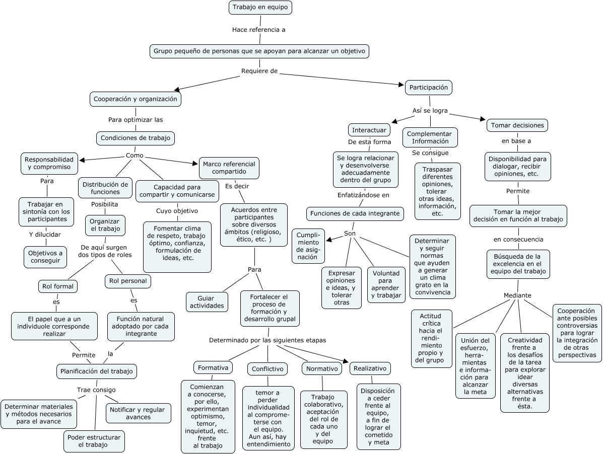 Este Cmap, tiene información relacionada con: Trabajo en equipo, Funciones de cada integrante Son Cumpli- miento de asig- nación, Fortalecer el proceso de formación y desarrollo grupal Determinado por las siguientes etapas Realizativo, Rol personal es Función natural adoptado por cada integrante, Disponibilidad para dialogar, recibir opiniones, etc. Permite Tomar la mejor decisión en función al trabajo, Cooperación y organización Para optimizar las Condiciones de trabajo, Interactuar De esta forma Se logra relacionar y desenvolverse adecuadamente dentro del grupo, Formativa ???? Comienzan a conocerse, por ello, experimentan optimismo, temor, inquietud, etc. frente al trabajo, Conflictivo ???? temor a perder individualidad al comprome- terse con el equipo. Aun así, hay entendimiento, Participación Así se logra Tomar decisiones, Participación Así se logra Interactuar, Búsqueda de la excelencia en el equipo del trabajo Mediante Unión del esfuerzo, herra- mientas e informa- ción para alcanzar la meta, Rol formal es El papel que a un individuole corresponde realizar, Tomar la mejor decisión en función al trabajo en consecuencia Búsqueda de la excelencia en el equipo del trabajo, Grupo pequeño de personas que se apoyan para alcanzar un objetivo Requiere de Participación, Condiciones de trabajo Como Responsabilidad y compromiso, Fortalecer el proceso de formación y desarrollo grupal Determinado por las siguientes etapas Conflictivo, Acuerdos entre participantes sobre diversos ámbitos (religioso, ético, etc. ) Para Guiar actividades, Planificación del trabajo Trae consigo Poder estructurar el trabajo, Búsqueda de la excelencia en el equipo del trabajo Mediante Actitud crítica hacia el rendi- miento propio y del grupo, Trabajar en sintonía con los participantes Y dilucidar Objetivos a conseguir