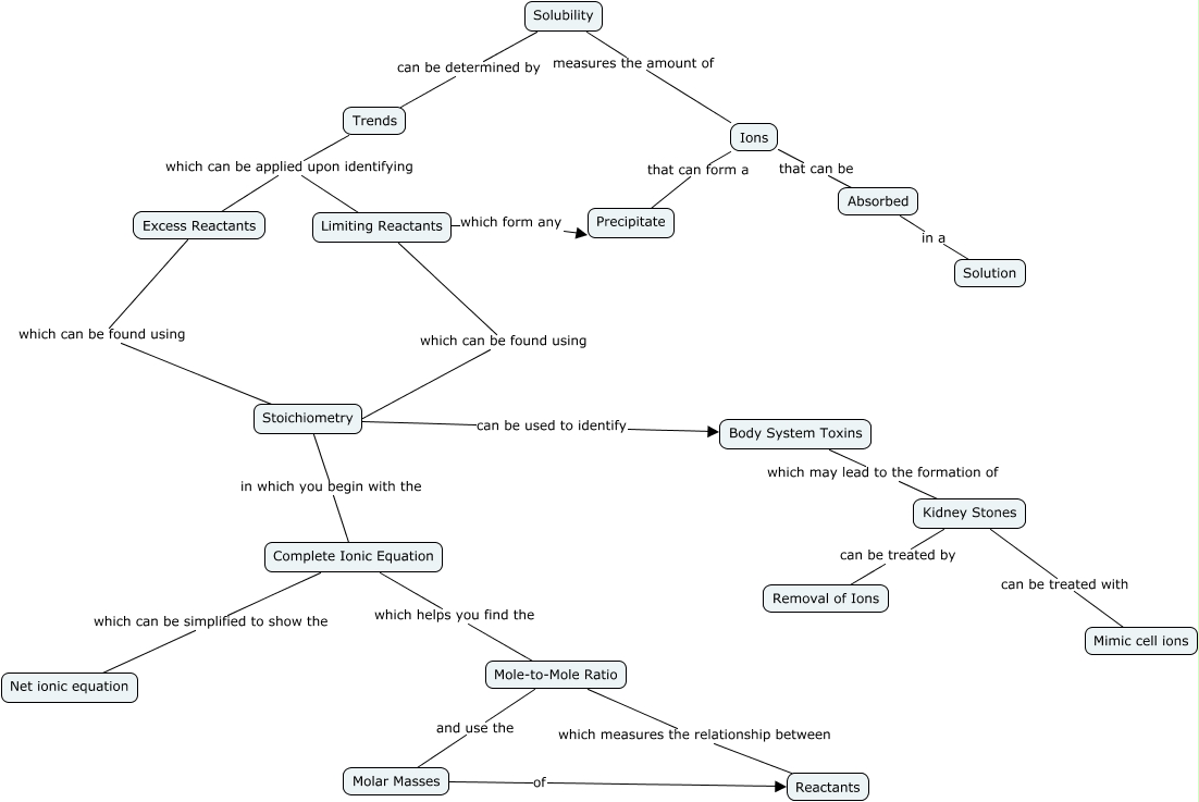 This Concept Map, created with IHMC CmapTools, has information related to: Solubility, Solubility measures the amount of Ions, Limiting Reactants which form any Precipitate, Mole-to-Mole Ratio and use the Molar Masses, Body System Toxins which may lead to the formation of Kidney Stones, Complete Ionic Equation which helps you find the Mole-to-Mole Ratio, Absorbed in a Solution, Complete Ionic Equation which can be simplified to show the Net ionic equation, Kidney Stones can be treated with Mimic cell ions, Kidney Stones can be treated by Removal of Ions, Limiting Reactants which can be found using Stoichiometry, Excess Reactants which can be found using Stoichiometry, Stoichiometry can be used to identify Body System Toxins, Trends which can be applied upon identifying Limiting Reactants, Solubility can be determined by Trends, Stoichiometry in which you begin with the Complete Ionic Equation, Trends which can be applied upon identifying Excess Reactants, Ions that can be Absorbed, Mole-to-Mole Ratio which measures the relationship between Reactants, Molar Masses of Reactants, Ions that can form a Precipitate