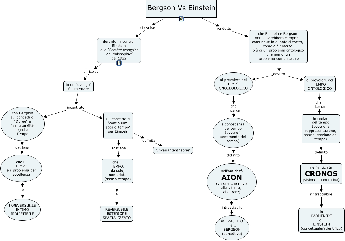 Questa Cmap, creata con IHMC CmapTools, contiene informazioni relative a: Bergson Vs Einstein, che il TEMPO, da solo, non esiste (spazio-tempo) è REVERSIBILE ESTERIORE SPAZIALIZZATO, durante l'incontro: Einstein alla “Société française de Philosophie” del 1922 si risolse in un "dialogo" fallimentare, nell'antichità AION (visione che rinvia alla vitalità, al durare) rintracciabile in ERACLITO e... BERGSON (percettivo), la realtà del tempo (ovvero la rappresentazione, spazializzazione del tempo) definito nell'antichità CRONOS (visione quantitativa), sul concetto di "continuum spazio-tempo" per Einstein definita "Invariantentheorie", che Einstein e Bergson non si sarebbero compresi comunque in quanto si tratta, come già emerso più di un problema ontologico che non di un problema comunicativo dovuto al prevalere del TEMPO GNOSEOLOGICO, al prevalere del TEMPO GNOSEOLOGICO che ricerca la conoscenza del tempo (ovvero il sentimento del tempo), Bergson Vs Einstein va detto che Einstein e Bergson non si sarebbero compresi comunque in quanto si tratta, come già emerso più di un problema ontologico che non di un problema comunicativo, la conoscenza del tempo (ovvero il sentimento del tempo) definito nell'antichità AION (visione che rinvia alla vitalità, al durare), in un "dialogo" fallimentare incentrato sul concetto di "continuum spazio-tempo" per Einstein, con Bergson sui concetti di "Durée" e "simultanéité" legati al Tempo sostiene che il TEMPO è il problema per eccellenza, Bergson Vs Einstein si svolse durante l'incontro: Einstein alla “Société française de Philosophie” del 1922, sul concetto di "continuum spazio-tempo" per Einstein sostiene che il TEMPO, da solo, non esiste (spazio-tempo), al prevalere del TEMPO ONTOLOGICO che ricerca la realtà del tempo (ovvero la rappresentazione, spazializzazione del tempo), in un "dialogo" fallimentare incentrato con Bergson sui concetti di "Durée" e "simultanéité" legati al Tempo, nell'antichità CRONOS (visione quantitativa) rintracciabile in PARMENIDE e... EINSTEIN (concettuale/scientifico), che il TEMPO è il problema per eccellenza è IRREVERSIBILE INTIMO IRRIPETIBILE, che Einstein e Bergson non si sarebbero compresi comunque in quanto si tratta, come già emerso più di un problema ontologico che non di un problema comunicativo dovuto al prevalere del TEMPO ONTOLOGICO