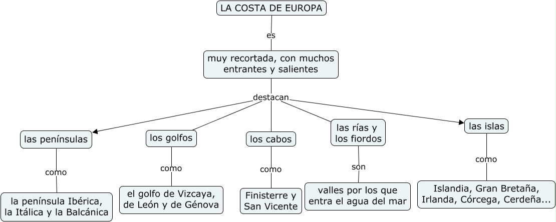Este Cmap, tiene información relacionada con: La costa de Europa, las rías y los fiordos son valles por los que entra el agua del mar, muy recortada, con muchos entrantes y salientes destacan los cabos, muy recortada, con muchos entrantes y salientes destacan las penínsulas, muy recortada, con muchos entrantes y salientes destacan las rías y los fiordos, LA COSTA DE EUROPA es muy recortada, con muchos entrantes y salientes, las islas como Islandia, Gran Bretaña, Irlanda, Córcega, Cerdeña..., los golfos como el golfo de Vizcaya, de León y de Génova, muy recortada, con muchos entrantes y salientes destacan los golfos, muy recortada, con muchos entrantes y salientes destacan las islas, los cabos como Finisterre y San Vicente, las penínsulas como la península Ibérica, la Itálica y la Balcánica
