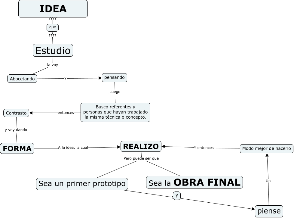 Este Cmap, tiene información relacionada con: MAPA Daniel Fco. Ballesta García, pensando Luego Busco referentes y personas que hayan trabajado la misma técnica o concepto., REALIZO Pero puede ser que Sea la OBRA FINAL, Busco referentes y personas que hayan trabajado la misma técnica o concepto. entonces Contrasto, REALIZO Pero puede ser que Sea un primer prototipo, piense Un Modo mejor de hacerlo, Modo mejor de hacerlo Y entonces REALIZO, Contrasto y voy dando FORMA, que ???? Estudio, Abocetando y pensando, Sea un primer prototipo ???? piense, FORMA A la idea, la cual REALIZO, Estudio la voy Abocetando, IDEA ???? que
