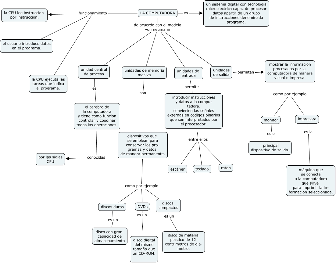 Este Cmap, tiene información relacionada con: Mihalis Archer 8B 1 La computadora, dispositivos que se emplean para conservar los pro- gramas y datos de manera permanente. como por ejemplo discos duros, introducir instrucciones y datos a la compu- tadora. convierten las señales externas en codigos binarios que son interpretados por el procesador. entre ellos escáner, unidad central de proceso es el cerebro de la computadora y tiene como funcion controlar y coodinar todas las operaciones., LA COMPUTADORA de acuerdo con el modelo von neumann unidades de salida, unidades de entrada permite introducir instrucciones y datos a la compu- tadora. convierten las señales externas en codigos binarios que son interpretados por el procesador., impresora es la máquina que se conecta a la computadora que sirve para imprimir la in- formacion seleccionada., mostrar la informacion procesadas por la computadora de manera visual o impresa. como por ejemplo monitor, LA COMPUTADORA es un sistema digital con tecnologia microelectrica capaz de procesar datos apartir de un grupo de instrucciones denominada programa., discos duros es un disco con gran capacidad de almacenamiento, dispositivos que se emplean para conservar los pro- gramas y datos de manera permanente. como por ejemplo DVDs, monitor es el principal dispositivo de salida., el cerebro de la computadora y tiene como funcion controlar y coodinar todas las operaciones. conocidas por las siglas CPU, LA COMPUTADORA de acuerdo con el modelo von neumann unidades de entrada, LA COMPUTADORA funcionamiento la CPU ejecuta las tareas que indica el programa., LA COMPUTADORA de acuerdo con el modelo von neumann unidad central de proceso, LA COMPUTADORA de acuerdo con el modelo von neumann unidades de memoria masiva, unidades de salida permiten mostrar la informacion procesadas por la computadora de manera visual o impresa., DVDs es un disco digital del mismo tamaño que un CD-ROM., introducir instrucciones y datos a la compu- tadora. convierten las señales externas en codigos binarios que son interpretados por el procesador. entre ellos teclado, mostrar la informacion procesadas por la computadora de manera visual o impresa. como por ejemplo impresora
