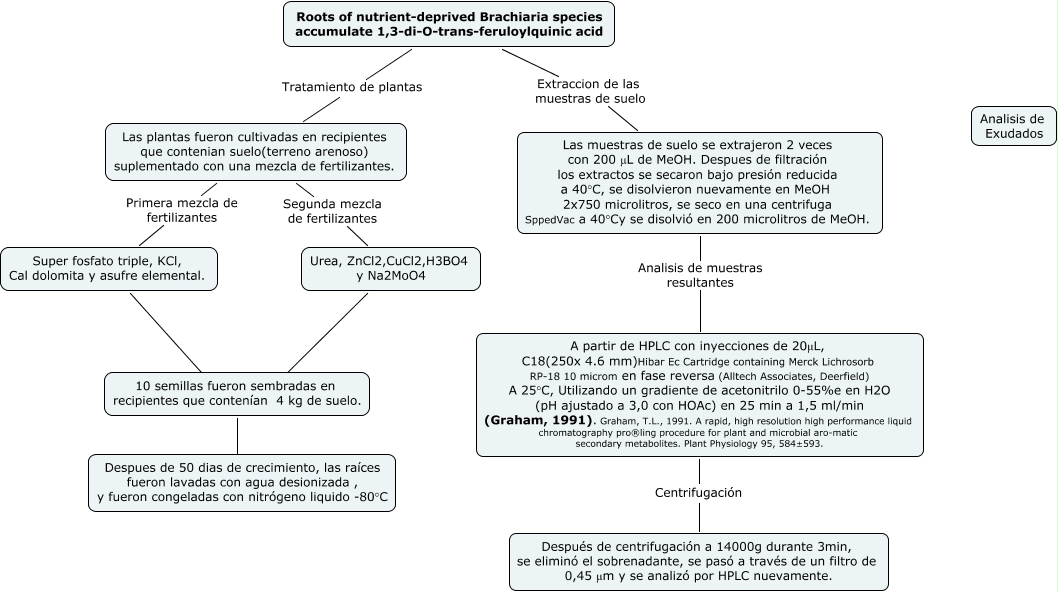 Este Cmap, tiene información relacionada con: Roots of nutrient-deprived Brachiaria species accumulate 1,3-di-O-trans-feruloylquinic acid(7), 10 semillas fueron sembradas en recipientes que contenían 4 kg de suelo. ???? Despues de 50 dias de crecimiento, las raíces fueron lavadas con agua desionizada , y fueron congeladas con nitrógeno liquido -80°C, Roots of nutrient-deprived Brachiaria species accumulate 1,3-di-O-trans-feruloylquinic acid Tratamiento de plantas Las plantas fueron cultivadas en recipientes que contenian suelo(terreno arenoso) suplementado con una mezcla de fertilizantes., Urea, ZnCl2,CuCl2,H3BO4 y Na2MoO4 ???? 10 semillas fueron sembradas en recipientes que contenían 4 kg de suelo., Las muestras de suelo se extrajeron 2 veces con 200 μL de MeOH. Despues de filtración los extractos se secaron bajo presión reducida a 40°C, se disolvieron nuevamente en MeOH 2x750 microlitros, se seco en una centrifuga SppedVac a 40°Cy se disolvió en 200 microlitros de MeOH. Analisis de muestras resultantes A partir de HPLC con inyecciones de 20μL, C18(250x 4.6 mm)Hibar Ec Cartridge containing Merck Lichrosorb RP-18 10 microm en fase reversa (Alltech Associates, Deerfield) A 25°C, Utilizando un gradiente de acetonitrilo 0-55%e en H2O (pH ajustado a 3,0 con HOAc) en 25 min a 1,5 ml/min (Graham, 1991). Graham, T.L., 1991. A rapid, high resolution high performance liquid chromatography pro®ling procedure for plant and microbial aro-matic secondary metabolites. Plant Physiology 95, 584±593., A partir de HPLC con inyecciones de 20μL, C18(250x 4.6 mm)Hibar Ec Cartridge containing Merck Lichrosorb RP-18 10 microm en fase reversa (Alltech Associates, Deerfield) A 25°C, Utilizando un gradiente de acetonitrilo 0-55%e en H2O (pH ajustado a 3,0 con HOAc) en 25 min a 1,5 ml/min (Graham, 1991). Graham, T.L., 1991. A rapid, high resolution high performance liquid chromatography pro®ling procedure for plant and microbial aro-matic secondary metabolites. Plant Physiology 95, 584±593. Centrifugación Después de centrifugación a 14000g durante 3min, se eliminó el sobrenadante, se pasó a través de un filtro de 0,45 μm y se analizó por HPLC nuevamente., Roots of nutrient-deprived Brachiaria species accumulate 1,3-di-O-trans-feruloylquinic acid Extraccion de las muestras de suelo Las muestras de suelo se extrajeron 2 veces con 200 μL de MeOH. Despues de filtración los extractos se secaron bajo presión reducida a 40°C, se disolvieron nuevamente en MeOH 2x750 microlitros, se seco en una centrifuga SppedVac a 40°Cy se disolvió en 200 microlitros de MeOH., Las plantas fueron cultivadas en recipientes que contenian suelo(terreno arenoso) suplementado con una mezcla de fertilizantes. Segunda mezcla de fertilizantes Urea, ZnCl2,CuCl2,H3BO4 y Na2MoO4, Las plantas fueron cultivadas en recipientes que contenian suelo(terreno arenoso) suplementado con una mezcla de fertilizantes. Primera mezcla de fertilizantes Super fosfato triple, KCl, Cal dolomita y asufre elemental., Super fosfato triple, KCl, Cal dolomita y asufre elemental. ???? 10 semillas fueron sembradas en recipientes que contenían 4 kg de suelo.