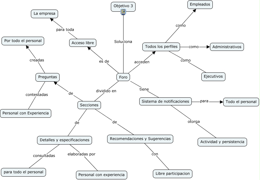 Este Cmap, tiene información relacionada con: foro, Preguntas creadas Por todo el personal, Foro Soluciona Objetivo 3, Sistema de notificaciones otorga Actividad y persistencia, Acceso libre para toda La empresa, Foro es de Acceso libre, Detalles y especificaciones elaboradas por Personal con experiencia, Secciones de Detalles y especificaciones, Secciones de Recomendaciones y Sugerencias, Recomendaciones y Sugerencias con Libre participacion, Todos los perfiles como Administrativos, Foro tiene Sistema de notificaciones, Todos los perfiles como Ejecutivos, Foro acceden Todos los perfiles, Todos los perfiles como Empleados, Preguntas contestadas Personal con Experiencia, Detalles y especificaciones consultadas para todo el personal, Secciones de Preguntas, Foro dividido en Secciones, Sistema de notificaciones para Todo el personal