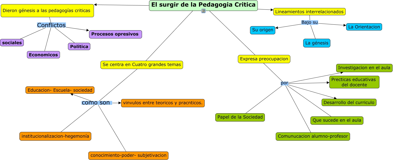 Este Cmap, tiene información relacionada con: El Surgir de la Pedagogia Critica, El surgir de la Pedagogia Critica por Comunucacion alumno-profesor, Dieron génesis a las pedagogías criticas Conflictos Procesos opresivos, El surgir de la Pedagogia Critica por Investigacion en el aula, Se centra en Cuatro grandes temas como son vinvulos entre teoricos y pracnticos., Lineamientos interrelacionados Bajo su La Orientacion, El surgir de la Pedagogia Critica por Papel de la Sociedad, El surgir de la Pedagogia Critica por Desarrollo del curriculo, Dieron génesis a las pedagogías criticas Conflictos Economicos, Dieron génesis a las pedagogías criticas Conflictos sociales, El surgir de la Pedagogia Critica ???? Se centra en Cuatro grandes temas, Lineamientos interrelacionados Bajo su La génesis, El surgir de la Pedagogia Critica por Que sucede en el aula, El surgir de la Pedagogia Critica ???? Lineamientos interrelacionados, Se centra en Cuatro grandes temas como son Educacion- Escuela- sociedad, Lineamientos interrelacionados Bajo su Su origen, El surgir de la Pedagogia Critica por Precticas educativas del docente, Se centra en Cuatro grandes temas como son institucionalizacion-hegemonía, El surgir de la Pedagogia Critica ???? Dieron génesis a las pedagogías criticas, Dieron génesis a las pedagogías criticas Conflictos Politica, Se centra en Cuatro grandes temas como son conocimiento-poder- subjetivacion