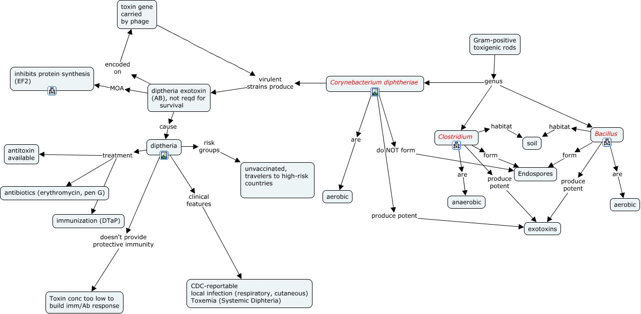 This Concept Map, created with IHMC CmapTools, has information related to: Gram postive toxigenic rods, Bacillus form Endospores, Corynebacterium diphtheriae do NOT form Endospores, Clostridium produce potent exotoxins, Corynebacterium diphtheriae are aerobic, diptheria treatment antitoxin available, diptheria clinical features CDC-reportable local infection (respiratory, cutaneous) Toxemia (Systemic Diphteria), Corynebacterium diphtheriae virulent strains produce diptheria exotoxin (AB), not reqd for survival, Corynebacterium diphtheriae produce potent exotoxins, toxin gene carried by phage virulent strains produce diptheria exotoxin (AB), not reqd for survival, Clostridium habitat soil, diptheria risk groups unvaccinated, travelers to high-risk countries, diptheria doesn't provide protective immunity Toxin conc too low to build imm/Ab response, diptheria treatment immunization (DTaP), Gram-positive toxigenic rods genus Clostridium, Gram-positive toxigenic rods genus Corynebacterium diphtheriae, diptheria exotoxin (AB), not reqd for survival encoded on toxin gene carried by phage, Bacillus habitat soil, Clostridium are anaerobic, Clostridium form Endospores, Bacillus produce potent exotoxins