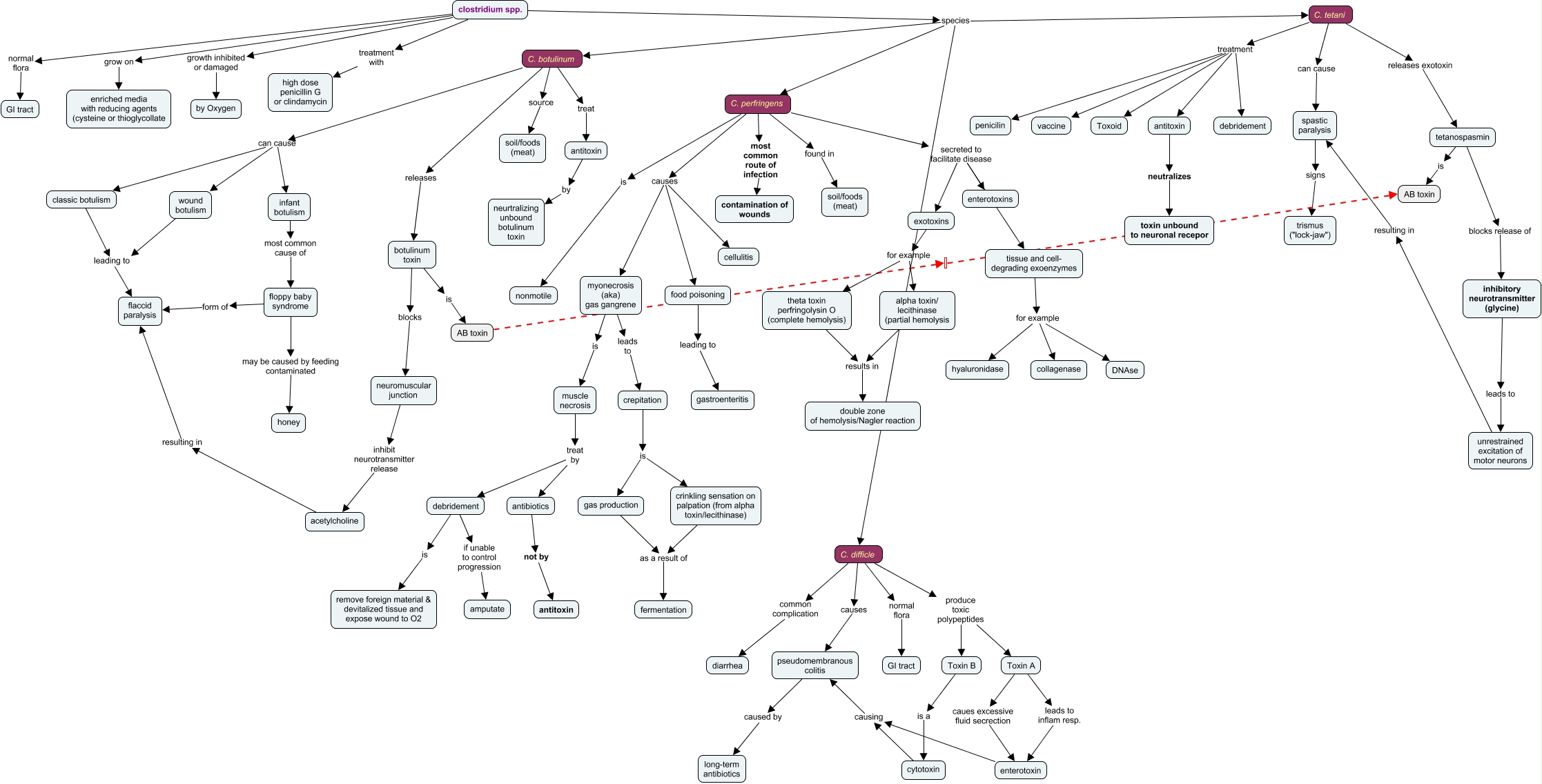 This Concept Map, created with IHMC CmapTools, has information related to: Clostridia complete, C. tetani treatment antitoxin, C. tetani can cause spastic paralysis, floppy baby syndrome form of flaccid paralysis, myonecrosis (aka) gas gangrene leads to crepitation, clostridium spp. species C. perfringens, C. difficle normal flora GI tract, tissue and cell- degrading exoenzymes for example DNAse, clostridium spp. treatment with high dose penicillin G or clindamycin, C. botulinum source soil/foods (meat), theta toxin perfringolysin O (complete hemolysis) results in double zone of hemolysis/Nagler reaction, acetylcholine resulting in flaccid paralysis, C. botulinum can cause wound botulism, C. tetani releases exotoxin tetanospasmin, alpha toxin/ lecithinase (partial hemolysis results in double zone of hemolysis/Nagler reaction, C. perfringens causes myonecrosis (aka) gas gangrene, tissue and cell- degrading exoenzymes for example collagenase, antitoxin neutralizes toxin unbound to neuronal recepor, infant botulism most common cause of floppy baby syndrome, C. botulinum releases botulinum toxin, food poisoning leading to gastroenteritis