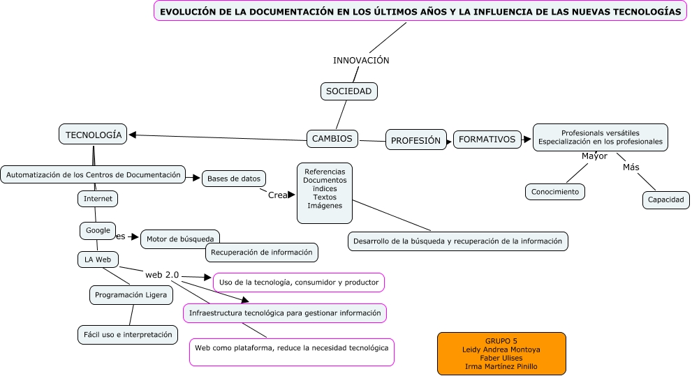 Este Cmap, tiene información relacionada con: centros de documentacion, EVOLUCIÓN DE LA DOCUMENTACIÓN EN LOS ÚLTIMOS AÑOS Y LA INFLUENCIA DE LAS NUEVAS TECNOLOGÍAS INNOVACIÓN CAMBIOS, EVOLUCIÓN DE LA DOCUMENTACIÓN EN LOS ÚLTIMOS AÑOS Y LA INFLUENCIA DE LAS NUEVAS TECNOLOGÍAS INNOVACIÓN SOCIEDAD, LA Web web 2.0 Uso de la tecnología, consumidor y productor, TECNOLOGÍA en Automatización de los Centros de Documentación, TECNOLOGÍA ???? LA Web, LA Web ???? Programación Ligera, Bases de datos Crea Referencias Documentos ïndices Textos Imágenes, CAMBIOS ???? PROFESIÓN, Google es Motor de búsqueda, Programación Ligera ???? ????, Referencias Documentos ïndices Textos Imágenes ???? Desarrollo de la búsqueda y recuperación de la información, TECNOLOGÍA ???? Internet, Profesionals versátiles Especialización en los profesionales Mayor Conocimiento, FORMATIVOS P Profesionals versátiles Especialización en los profesionales, TECNOLOGÍA en Bases de datos, LA Web web 2.0 Web como plataforma, reduce la necesidad tecnológica, CAMBIOS ???? FORMATIVOS, LA Web web 2.0 Infraestructura tecnológica para gestionar información, Profesionals versátiles Especialización en los profesionales Más Capacidad, CAMBIOS ???? TECNOLOGÍA