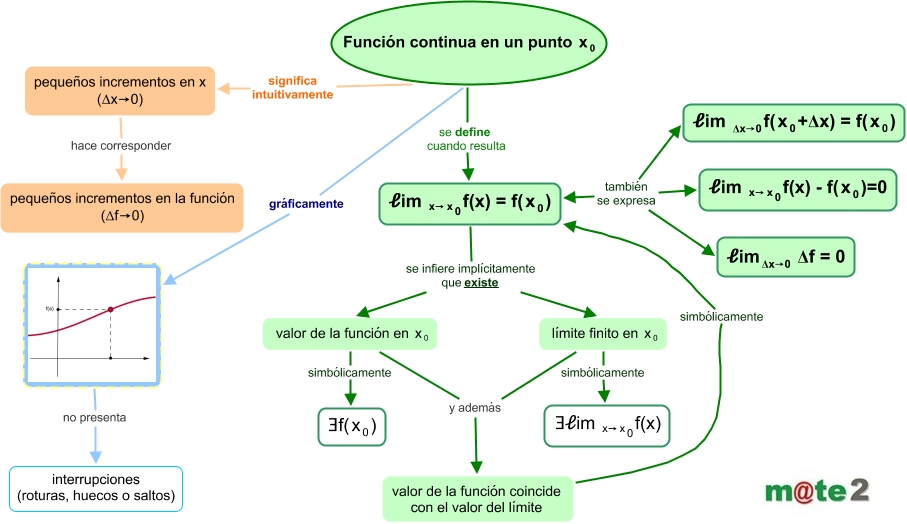 (Δf→0) </mtext> </mrow> </math>, no presenta interrupciones (roturas, huecos o saltos), <math xmlns="http://www.w3.org/1998/Math/MathML"> <mrow> <mtext> límite finito en </mtext> <mmultiscripts> <mtext> x </mtext> <mtext> 0 </mtext> <none/> </mmultiscripts> </mrow> </math> y además <math xmlns="http://www.w3.org/1998/Math/MathML"> <mrow> <mtext> valor de la función coincide