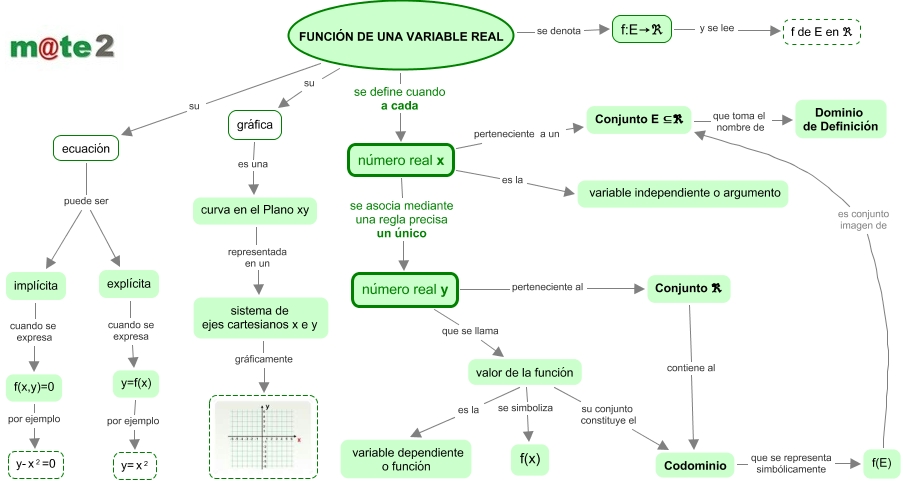Este Cmap, tiene información relacionada con: FUNCION DE UNA VARIABLE, valor de la función su conjunto constituye el Codominio, ecuación puede ser implícita, número real y perteneciente al Conjunto ℜ, valor de la función se simboliza f(x), FUNCIÓN DE UNA VARIABLE REAL se define cuando a cada número real x, y=f(x) por ejemplo <math xmlns="http://www.w3.org/1998/Math/MathML"> <mrow> <mtext> y= </mtext> <mmultiscripts> <mtext> x </mtext> <none/> <mtext> 2 </mtext> </mmultiscripts> </mrow> </math>, curva en el Plano xy representada en un sistema de ejes cartesianos x e y, f(x,y)=0 por ejemplo <math xmlns="http://www.w3.org/1998/Math/MathML"> <mrow> <mtext> y- </mtext> <mmultiscripts> <mtext> x </mtext> <none/> <mtext> 2 </mtext> </mmultiscripts> <mtext> =0 </mtext> </mrow> </math>, valor de la función es la variable dependiente o función, Conjunto ℜ contiene al Codominio, FUNCIÓN DE UNA VARIABLE REAL su ecuación, número real y que se llama valor de la función, ecuación puede ser explícita, número real x perteneciente a un Conjunto E ⊆ℜ, gráfica es una curva en el Plano xy, sistema de ejes cartesianos x e y gráficamente, número real x es la variable independiente o argumento, f(E) es conjunto imagen de Conjunto E ⊆ℜ, FUNCIÓN DE UNA VARIABLE REAL se denota f:E→ℜ, explícita cuando se expresa y=f(x)