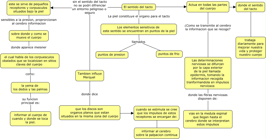 Este Cmap, tiene información relacionada con: mapa conceptual, el sentido del tacto, que los discos son organos planos que estan situados en la misma zona del cuerpo ???? cuando se estimula se cree que los impulsos de estos receptores se encargan de:, El sentido del tacto sin el sentido del tacto no se podri difrenciar un entorno peligroso o seguro Tambien influye Merquel, el cual habla de los corpuesculos obalados que se localoizan en sitios claves del cuerpo como: la yema de los dedos y las palmas, Las determinaciones nerviosas se difurcan por la capa exterior de la piel llamada epidermis, tomando la informacion recogida tranformandola en impulsos nerviosos donde las fibras nerviosas disponen de: vias en la medula espinal que llegan hasta el cerebro donde se interpretan estos impulsos, Tambien influye Merquel donde dice que los discos son organos planos que estan situados en la misma zona del cuerpo, El sentido del tacto Actua en todas las partes del cuerpo, cuando se estimula se cree que los impulsos de estos receptores se encargan de: ???? informar al cerebro sobre la palpacion continua, Los elementos sensitivos de este sentido se encuentran en puntos de la piel llamados puntos de frio, este se sirve de pequeños receptores y corpusculos situados bajo la piel sensibles a la presion, proprorcionan al cerebro informacion sobre donde y como se mueve el cuerpo, sobre donde y como se mueve el cuerpo donde aparece meisner el cual habla de los corpuesculos obalados que se localoizan en sitios claves del cuerpo, donde el sentido del tacto ???? trabaja diariamente para mejorar nuestra vida y proteger nuestro cuerpo, la yema de los dedos y las palmas su funcion principal es: informar al cuerpo de cuando y donde se toca la piel., El sentido del tacto sin el sentido del tacto no se podri difrenciar un entorno peligroso o seguro este se sirve de pequeños receptores y corpusculos situados bajo la piel, Actua en todas las partes del cuerpo ???? donde el sentido del tacto, Actua en todas las partes del cuerpo ¿Como se transmite al cerebro la informacion que se recoge? Las determinaciones nerviosas se difurcan por la capa exterior de la piel llamada epidermis, tomando la informacion recogida tranformandola en impulsos nerviosos, Los elementos sensitivos de este sentido se encuentran en puntos de la piel llamados puntos de presion, El sentido del tacto La piel constituye el organo para el tacto Los elementos sensitivos de este sentido se encuentran en puntos de la piel