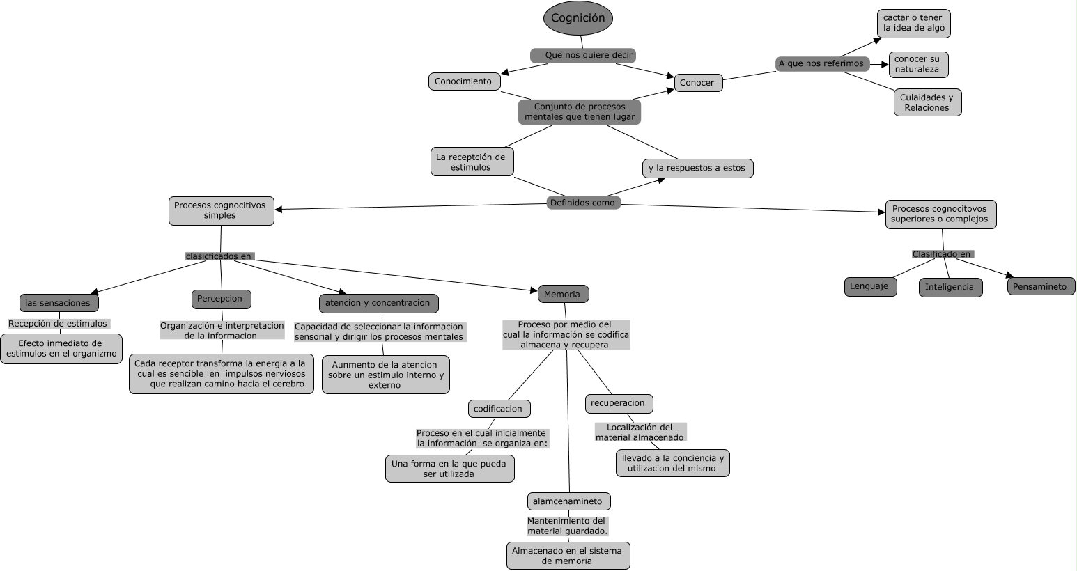 Este Cmap, tiene información relacionada con: cognicion, atencion y concentracion Capacidad de seleccionar la informacion sensorial y dirigir los procesos mentales Aunmento de la atencion sobre un estimulo interno y externo, codificacion Proceso en el cual inicialmente la información se organiza en: Una forma en la que pueda ser utilizada, Memoria Proceso por medio del cual la información se codifica almacena y recupera recuperacion, Conocimiento Conjunto de procesos mentales que tienen lugar La receptción de estimulos, Memoria Proceso por medio del cual la información se codifica almacena y recupera alamcenamineto, Conocimiento Conjunto de procesos mentales que tienen lugar y la respuestos a estos, Memoria Proceso por medio del cual la información se codifica almacena y recupera codificacion, Conocer A que nos referimos conocer su naturaleza, Cognición Que nos quiere decir Conocimiento, alamcenamineto Mantenimiento del material guardado. Almacenado en el sistema de memoria, Procesos cognocitovos superiores o complejos Clasificado en Pensamineto, Conocer A que nos referimos Culaidades y Relaciones, Cognición Que nos quiere decir Conocer, Procesos cognocitivos simples clasicficados en Memoria, Procesos cognocitovos superiores o complejos Clasificado en Inteligencia, recuperacion Localización del material almacenado llevado a la conciencia y utilizacion del mismo, Procesos cognocitivos simples clasicficados en las sensaciones, La receptción de estimulos Definidos como Procesos cognocitivos simples, La receptción de estimulos Definidos como Procesos cognocitovos superiores o complejos, Conocimiento Conjunto de procesos mentales que tienen lugar Conocer
