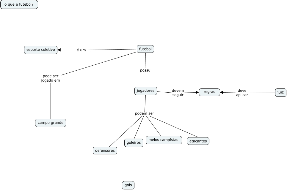 Esse mapa conceitual, produzido no IHMC CmapTools, tem a informação relacionada a: o que é futebol II STEFANA, futebol pode ser jogado em campo grande, jogadores podem ser defensores, jogadores podem ser goleiros, jogadores podem ser atacantes, jogadores devem seguir regras, jogadores podem ser meios campistas, futebol pode ser jogado em campo grande, juiz deve aplicar regras, futebol é um esporte coletivo, futebol possui jogadores