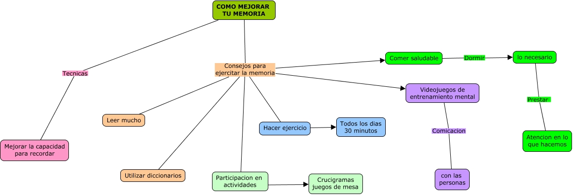 Este Cmap, tiene información relacionada con: MEMORIA, COMO MEJORAR TU MEMORIA Consejos para ejercitar la memoria Leer mucho, COMO MEJORAR TU MEMORIA Consejos para ejercitar la memoria Videojuegos de entrenamiento mental, Videojuegos de entrenamiento mental Comicacion con las personas, COMO MEJORAR TU MEMORIA Consejos para ejercitar la memoria Participacion en actividades, COMO MEJORAR TU MEMORIA Tecnicas Mejorar la capacidad para recordar, Participacion en actividades ???? Crucigramas juegos de mesa, COMO MEJORAR TU MEMORIA Consejos para ejercitar la memoria Comer saludable, COMO MEJORAR TU MEMORIA Consejos para ejercitar la memoria Hacer ejercicio, Hacer ejercicio ???? Todos los dias 30 minutos, lo necesario Prestar Atencion en lo que hacemos, Comer saludable Dormir lo necesario, COMO MEJORAR TU MEMORIA Consejos para ejercitar la memoria Utilizar diccionarios