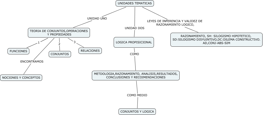 Este Cmap, tiene información relacionada con: LOGICA MATEMÁTICA, LOGICA PROPISICIONAL COMO METDOLOGIA,RAZONAMIENTO, ANALISIS,RESULTADOS, CONCLUSIONES Y RECOIMENDACIONES, METDOLOGIA,RAZONAMIENTO, ANALISIS,RESULTADOS, CONCLUSIONES Y RECOIMENDACIONES COMO MEDIO CONJUNTOS Y LOGICA, UNIDADES TEMATICAS UNIDAD UNO TEORIA DE CONJUNTOS,OPERACIONES Y PROPIEDADES, TEORIA DE CONJUNTOS,OPERACIONES Y PROPIEDADES 1 FUNCIONES, UNIDADES TEMATICAS UNIDAD DOS LOGICA PROPISICIONAL, UNIDADES TEMATICAS LEYES DE INFERENCIA Y VALIDEZ DE RAZONAMIENTO LOGICO, RAZONAMIENTO, SH: SILOGISMO HIPOTETICO, SD:SILOGISMO DISYUINTIVO,DC:DILEMA CONSTRUCTIVO. AD,CONJ-ABS-SIM, TEORIA DE CONJUNTOS,OPERACIONES Y PROPIEDADES ENCONTRAMOS NOCIONES Y CONCEPTOS, TEORIA DE CONJUNTOS,OPERACIONES Y PROPIEDADES 2 CONJUNTOS, TEORIA DE CONJUNTOS,OPERACIONES Y PROPIEDADES 3 RELACIONES