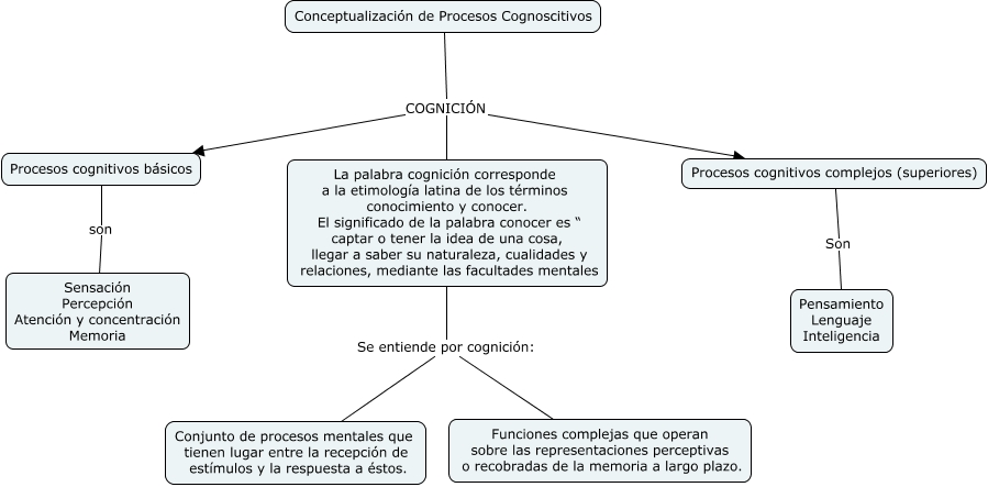 Este Cmap, tiene información relacionada con: Conceptualización de Procesos Cognoscitivos, Procesos cognitivos básicos son Sensación Percepción Atención y concentración Memoria, Conceptualización de Procesos Cognoscitivos COGNICIÓN Procesos cognitivos complejos (superiores), La palabra cognición corresponde a la etimología latina de los términos conocimiento y conocer. El significado de la palabra conocer es “ captar o tener la idea de una cosa, llegar a saber su naturaleza, cualidades y relaciones, mediante las facultades mentales Se entiende por cognición: Funciones complejas que operan sobre las representaciones perceptivas o recobradas de la memoria a largo plazo., Conceptualización de Procesos Cognoscitivos COGNICIÓN Procesos cognitivos básicos, La palabra cognición corresponde a la etimología latina de los términos conocimiento y conocer. El significado de la palabra conocer es “ captar o tener la idea de una cosa, llegar a saber su naturaleza, cualidades y relaciones, mediante las facultades mentales Se entiende por cognición: Conjunto de procesos mentales que tienen lugar entre la recepción de estímulos y la respuesta a éstos., Procesos cognitivos complejos (superiores) Son Pensamiento Lenguaje Inteligencia, Conceptualización de Procesos Cognoscitivos COGNICIÓN La palabra cognición corresponde a la etimología latina de los términos conocimiento y conocer. El significado de la palabra conocer es “ captar o tener la idea de una cosa, llegar a saber su naturaleza, cualidades y relaciones, mediante las facultades mentales