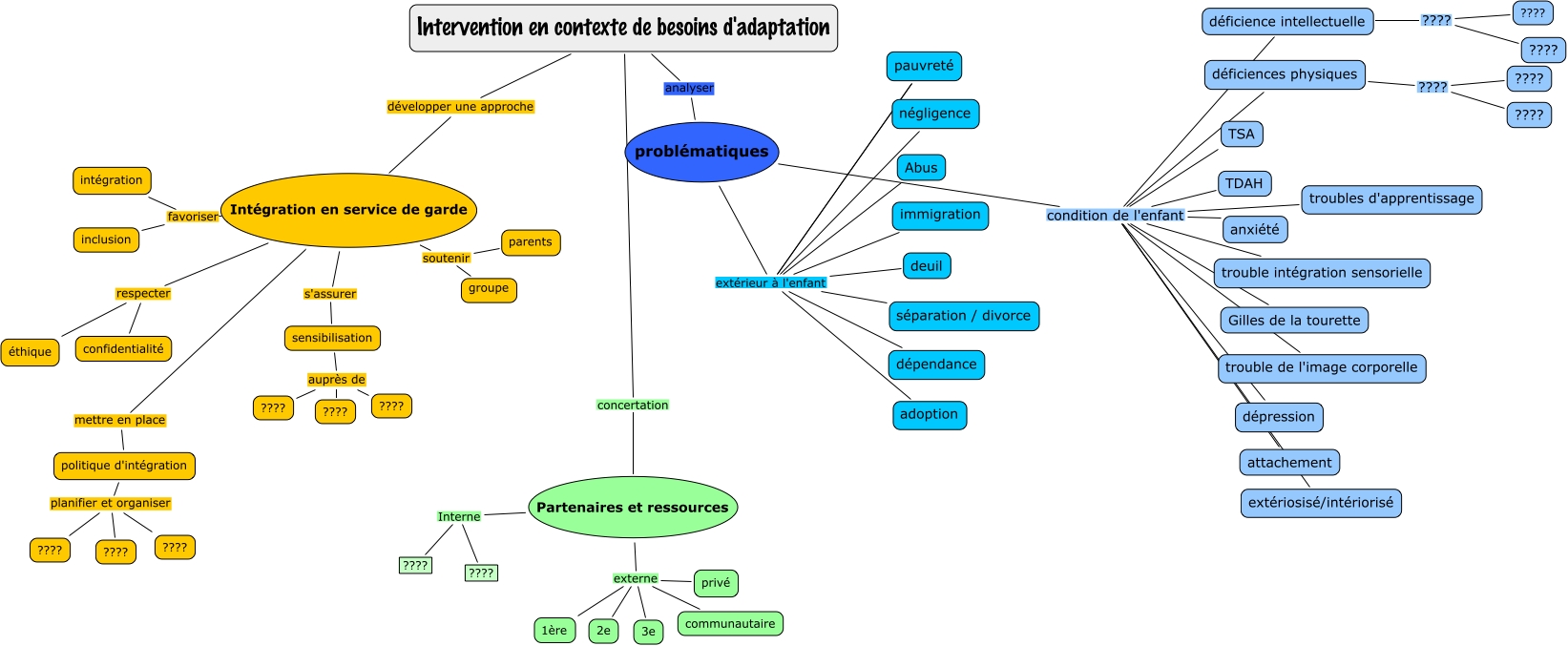 Cette carte de concepts créée avec IHMC CmapTools traite de: besoins d'adaptation, problématiques condition de l'enfant déficience intellectuelle, problématiques condition de l'enfant troubles d'apprentissage, Partenaires et ressources externe 2e, problématiques condition de l'enfant TDAH, problématiques extérieur à l'enfant négligence, Intégration en service de garde favoriser inclusion, politique d'intégration planifier et organiser ????, problématiques condition de l'enfant extériosisé/intériorisé, sensibilisation auprès de ????, Intégration en service de garde soutenir groupe, déficiences physiques ???? ????, problématiques extérieur à l'enfant adoption, problématiques extérieur à l'enfant séparation / divorce, Partenaires et ressources externe 3e, problématiques condition de l'enfant TSA, Intégration en service de garde mettre en place politique d'intégration, problématiques extérieur à l'enfant immigration, Partenaires et ressources Interne ????, déficiences physiques ???? ????, problématiques extérieur à l'enfant deuil