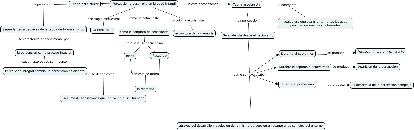 Este Cmap, tiene información relacionada con: Percepcion y desarrollo en la edad infantil, Percepcion y desarrollo en la edad infantil como se define esto como el conjunto de senaciones, la percepcion como proceso integral segun esto puede ser inverso Perce´cion integral cambia, la percepcion es distinta, Se evidencia desde el nacimiento como se lleva acabo Durante el cuato mes, como el conjunto de senaciones en el cual se encuentran Recuerdo, Durante el cuato mes se produce Pecepcion Integral y coherente, Percepcion y desarrollo en la edad infantil psicologia asocianista estructura de la memoria, Teoria asocianista Fundamento cualquiera que sea el entorno,las ideas se perciben ordenadas y coherentes, La Percepcion se define como La suma de sensaciones que influye en el ser humano, Segun la gestalt atravez de la teoria de forma y fondo se caracteriza principalmente por la percepcion como proceso integral, Durante el primer año se produce El desarrollo de la percepcion compleja, Se evidencia desde el nacimiento como se lleva acabo Durante el primer año, ideas con esto se forma la memoria, Percepcion y desarrollo en la edad infantil ???? Teoria estructurar, como el conjunto de senaciones en el cual se encuentran ideas, Teoria asocianista La percepcion Se evidencia desde el nacimiento, Se evidencia desde el nacimiento como se lleva acabo atravez del desarrollo y evolucion de la misma percepcion en cuanto a los cambios del entorno, Percepcion y desarrollo en la edad infantil En esta encontramos Teoria asocianista, Percepcion y desarrollo en la edad infantil psicologia estructural La Percepcion, Teoria estructurar La percepcion Segun la gestalt atravez de la teoria de forma y fondo, Recuerdo con esto se forma la memoria