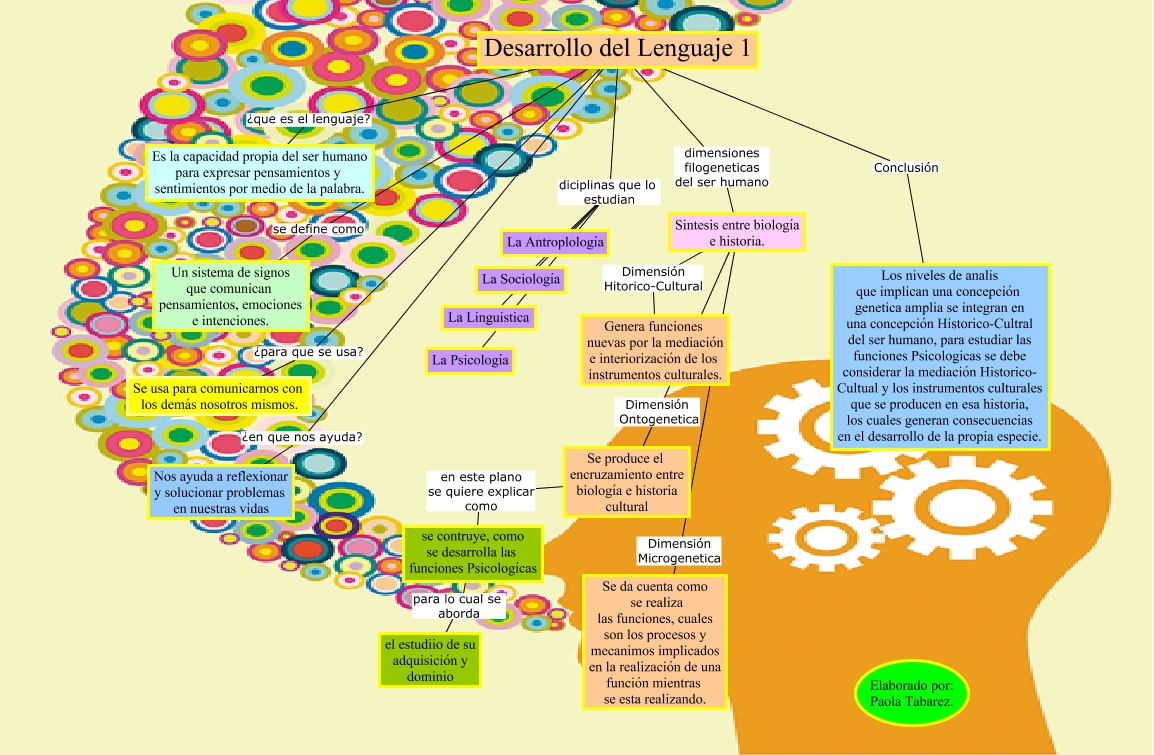Este Cmap, tiene información relacionada con: Desarrollo del Lenguaje 1, Desarrollo del Lenguaje 1 diciplinas que lo estudian La Sociología, Desarrollo del Lenguaje 1 se define como Un sistema de signos que comunican pensamientos, emociones e intenciones., Desarrollo del Lenguaje 1 ¿para que se usa? Se usa para comunicarnos con los demás nosotros mismos., Se produce el encruzamiento entre biología e historia cultural en este plano se quiere explicar como se contruye, como se desarrolla las funciones Psicologícas, Sintesis entre biología e historia. Dimensión Microgenetica Se da cuenta como se realiza las funciones, cuales son los procesos y mecanimos implicados en la realización de una función mientras se esta realizando., Desarrollo del Lenguaje 1 dimensiones filogeneticas del ser humano Sintesis entre biología e historia., se contruye, como se desarrolla las funciones Psicologícas para lo cual se aborda el estudiio de su adquisición y dominio, Desarrollo del Lenguaje 1 diciplinas que lo estudian La Psicología, Sintesis entre biología e historia. Dimensión Ontogenetica Se produce el encruzamiento entre biología e historia cultural, Desarrollo del Lenguaje 1 Conclusión Los niveles de analis que implican una concepción genetica amplia se integran en una concepción Historico-Cultral del ser humano, para estudiar las funciones Psicologicas se debe considerar la mediación Historico- Cultual y los instrumentos culturales que se producen en esa historia, los cuales generan consecuencias en el desarrollo de la propia especie., Desarrollo del Lenguaje 1 diciplinas que lo estudian La Antroplología, Desarrollo del Lenguaje 1 ¿en que nos ayuda? Nos ayuda a reflexionar y solucionar problemas en nuestras vidas, Sintesis entre biología e historia. Dimensión Hitorico-Cultural Genera funciones nuevas por la mediación e interiorización de los instrumentos culturales., Desarrollo del Lenguaje 1 diciplinas que lo estudian La Linguistica, Desarrollo del Lenguaje 1 ¿que es el lenguaje? Es la capacidad propia del ser humano para expresar pensamientos y sentimientos por medio de la palabra.