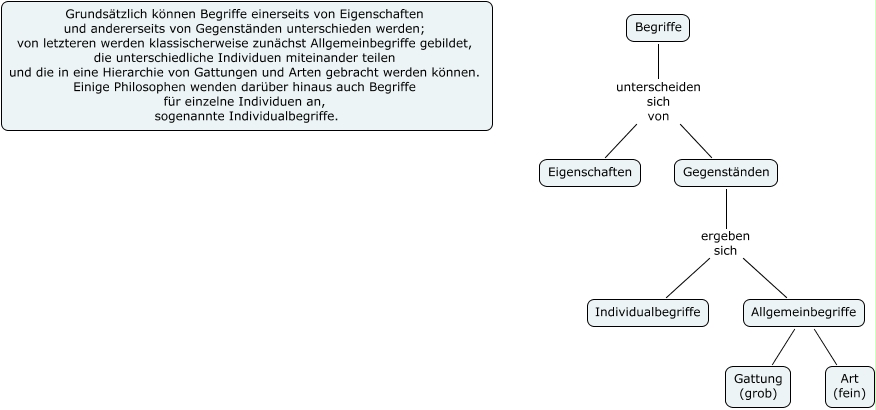 Dieses mit IHMC CmapTools erstellte CMap hat Informationen bezüglich: 003 Individual und Allgemeinbegriffe, Allgemeinbegriffe Gattung (grob), Gegenständen ergeben sich Allgemeinbegriffe, Gegenständen ergeben sich Individualbegriffe, Allgemeinbegriffe Art (fein), Begriffe unterscheiden sich von Gegenständen, Begriffe unterscheiden sich von Eigenschaften