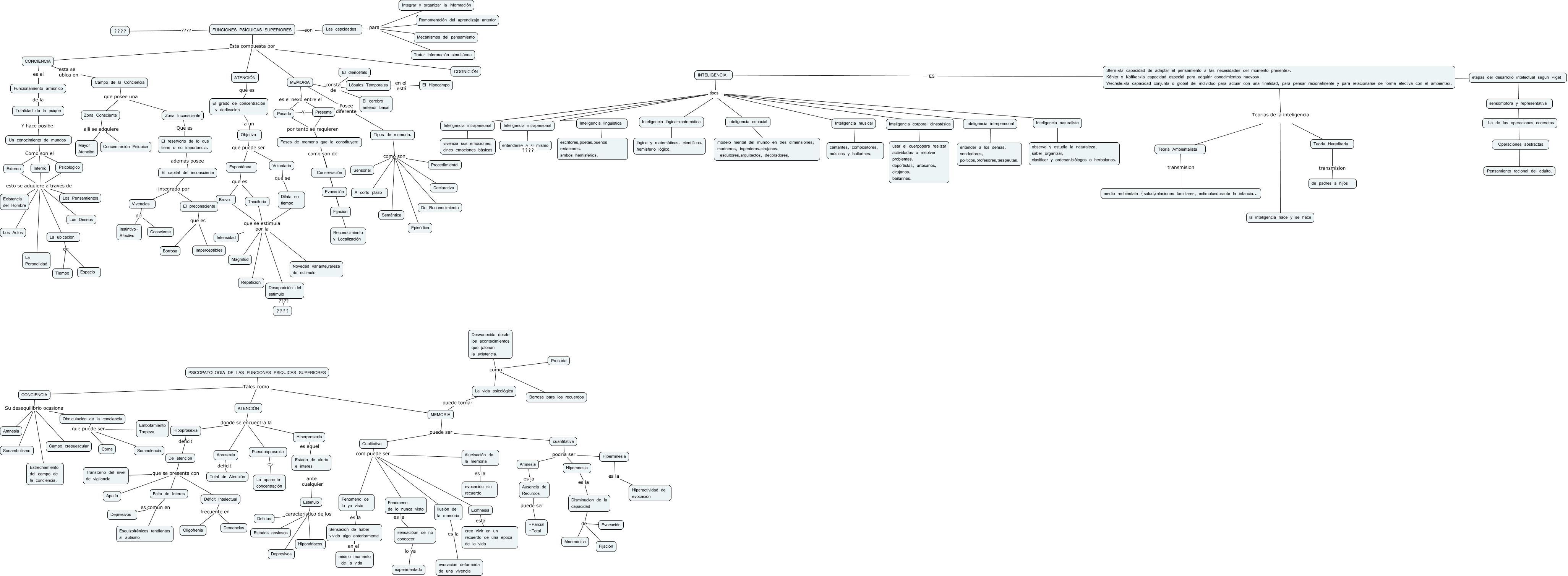 Este Cmap, tiene información relacionada con: psicologia syd, Stern:«la capacidad de adaptar el pensamiento a las necesidades del momento presente». Kóhler y Koffka:«la capacidad especial para adquirir conocimientos nuevos». Wechsle:«la capacidad conjunta o global del individuo para actuar con una finalidad, para pensar racionalmente y para relacionarse de forma efectiva con el ambiente». Teorias de la inteligencia Teoría Ambientalista, Cualitativa com puede ser Fenómeno de lo nunca visto, Fases de memoria que la constituyen: como son de Fijacion, FUNCIONES PSÍQUICAS SUPERIORES Esta compuesta por MEMORIA, El grado de concentración y dedicacion a un Objetivo, cuantitativa podria ser Amnesia, ATENCIÓN que es El grado de concentración y dedicacion, Breve que se estimula por la Tansitoria, Interno esto se adquiere a través de Los Actos, Presente por tanto se requieren Fases de memoria que la constituyen:, Breve que se estimula por la Novedad variante,rareza de estimulo, Tipos de memoria. como son Episódica, CONCIENCIA Su desequilibrio ocasiona Estrechamiento del campo de la conciencia., Ausencia de Recurdos puede ser -Parcial -Total, Disminucion de la capacidad de Mnemónica, Aprosexia deficit Total de Atención, Psicológico esto se adquiere a través de La Peronalidad, Cualitativa com puede ser Alucinación de la memoria, Externo esto se adquiere a través de La ubicacion, Externo esto se adquiere a través de La Peronalidad