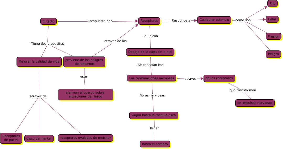 Este Cmap, tiene información relacionada con: El tacto, Cualquier estimulo como son Calor, El tacto Compuesto por Receptores, Receptores Se ubican Debajo de la capa de la piel, Las terminaciones nerviosas atravez de los receptores, Mejorar la calidad de vida atravez de receptores ovalados de meisner, El tacto Tiene dos propositos previene de los peligros del entornos, Cualquier estimulo como son Frio, viajan hasta la medula osea llegan hasta el cerebro, Las terminaciones nerviosas fibras nerviosas viajan hasta la medula osea, previene de los peligros del entornos este alarman al cuerpo sobre situaciones de riesgo, Cualquier estimulo como son Presion, previene de los peligros del entornos atravez de los Receptores, de los receptores que transforman en impulsos nerviosos, Mejorar la calidad de vida atravez de Receptores de pacini, Receptores Responde a Cualquier estimulo, Mejorar la calidad de vida atravez de disco de merkel, El tacto Tiene dos propositos Mejorar la calidad de vida, Cualquier estimulo como son Peligro, Debajo de la capa de la piel Se conectan con Las terminaciones nerviosas