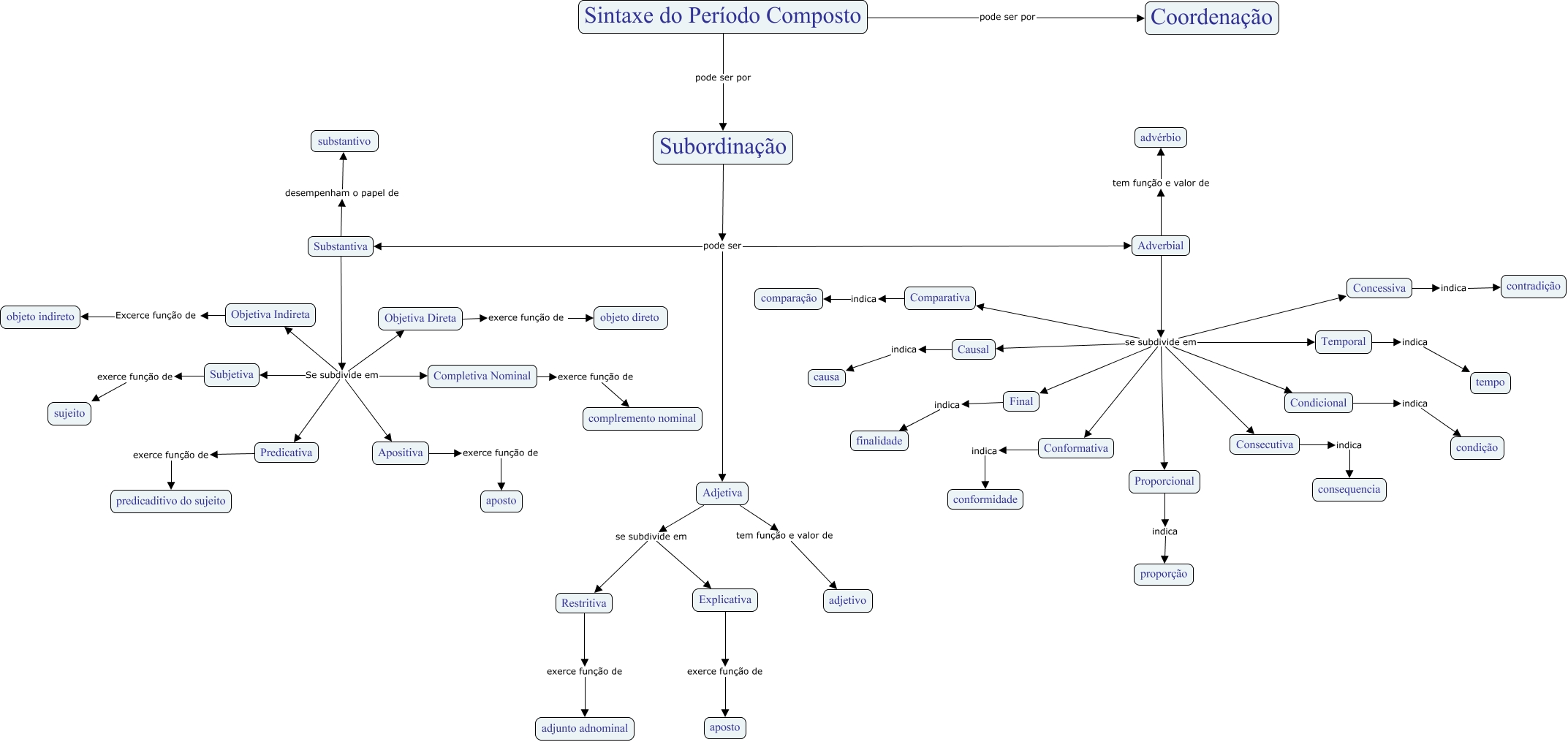 Esse mapa conceitual, produzido no IHMC CmapTools, tem a informação relacionada a: 3B BOA NOITE JÚLIA, Adverbial se subdivide em Temporal, Adverbial se subdivide em Concessiva, Apositiva exerce função de aposto, Concessiva indica contradição, Adverbial se subdivide em Comparativa, Subordinação pode ser Adjetiva, Subordinação pode ser Adverbial, Adjetiva se subdivide em Explicativa, Substantiva Se subdivide em Apositiva, Adverbial se subdivide em Consecutiva, Adverbial se subdivide em Conformativa, Restritiva exerce função de adjunto adnominal, Consecutiva indica consequencia, Adjetiva tem função e valor de adjetivo, Sintaxe do Período Composto pode ser por Subordinação, Adverbial se subdivide em Proporcional, Objetiva Indireta Excerce função de objeto indireto, Predicativa exerce função de predicaditivo do sujeito, Condicional indica condição, Adverbial tem função e valor de advérbio