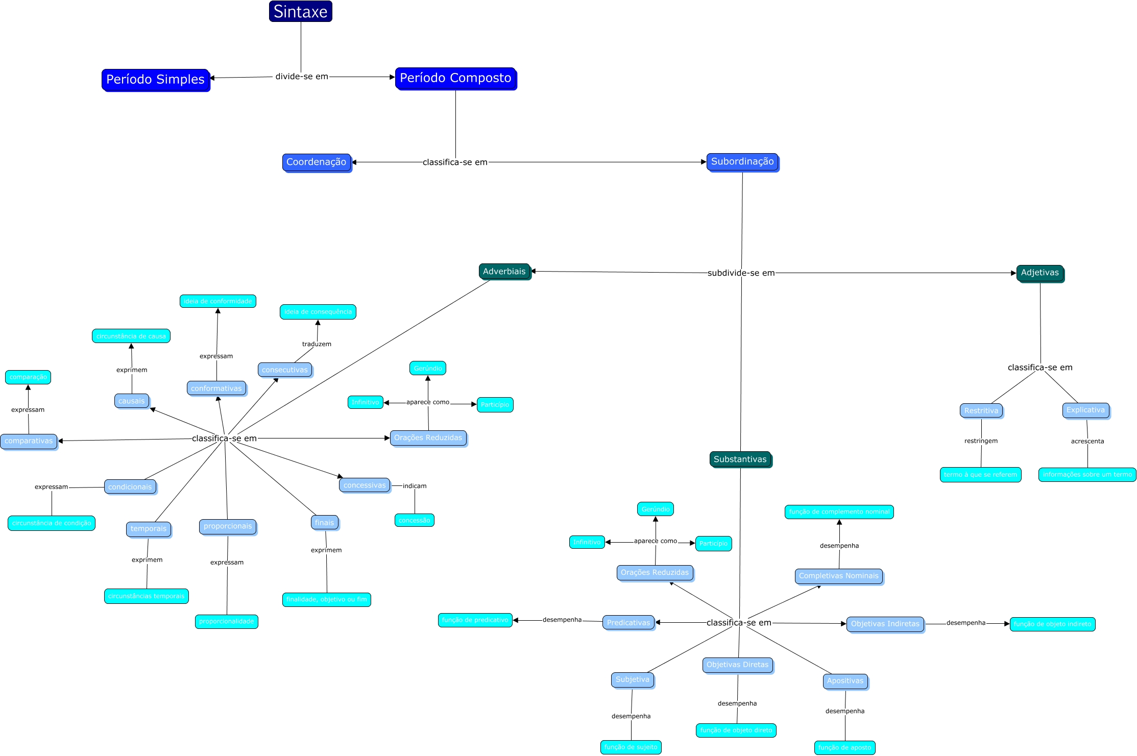 Esse mapa conceitual, produzido no IHMC CmapTools, tem a informação relacionada a: 3A Julia Julia Laura, Substantivas classifica-se em Objetivas Diretas, Adjetivas classifica-se em Restritiva, Objetivas Diretas desempenha função de objeto direto, finais exprimem finalidade, objetivo ou fim, Substantivas classifica-se em Subjetiva, Subordinação subdivide-se em Adjetivas, Substantivas classifica-se em Predicativas, Orações Reduzidas aparece como Gerúndio, Completivas Nominais desempenha função de complemento nominal, Adverbiais classifica-se em comparativas, Orações Reduzidas aparece como Particípio, Período Composto classifica-se em Coordenação, Objetivas Indiretas desempenha função de objeto indireto, causais exprimem circunstância de causa, Apositivas desempenha função de aposto, Orações Reduzidas aparece como Gerúndio, Adverbiais classifica-se em proporcionais, proporcionais expressam proporcionalidade, temporais exprimem circunstâncias temporais, Sintaxe divide-se em Período Composto