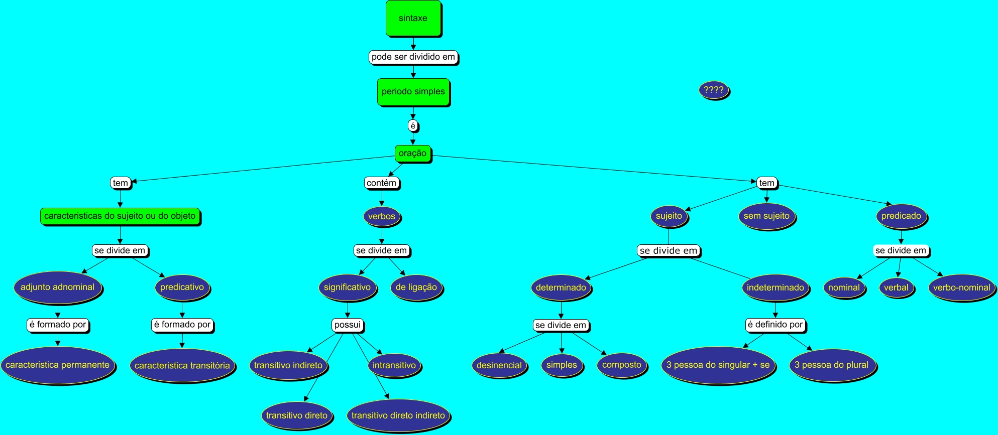 Esse mapa conceitual, produzido no IHMC CmapTools, tem a informação relacionada a: du gus iago 9B, determinado se divide em simples, sujeito se divide em indeterminado, oração tem sujeito, periodo simples é oração, significativo possui transitivo direto indireto, predicado se divide em verbal, predicado se divide em verbo-nominal, indeterminado é definido por 3 pessoa do plural, determinado se divide em composto, caracteristicas do sujeito ou do objeto se divide em predicativo, verbos se divide em de ligação, oração tem caracteristicas do sujeito ou do objeto, indeterminado é definido por 3 pessoa do singular + se, significativo possui transitivo indireto, caracteristicas do sujeito ou do objeto se divide em adjunto adnominal, oração tem predicado, determinado se divide em desinencial, sujeito se divide em determinado, oração tem sem sujeito, adjunto adnominal é formado por caracteristica permanente