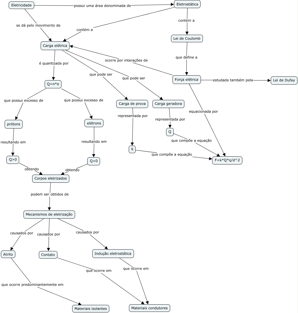 Esse mapa conceitual, produzido no IHMC CmapTools, tem a informação relacionada a: Eletrostática-DB, elétrons resultando em Qɘ, Qɘ obtendo Corpos eletrizados, Força elétrica equacionada por F=k*Q*q/d^2, Atrito que ocorre predominantemente em Materiais isolantes, Eletrostática contém a Lei de Coulomb, Q que compõe a equação F=k*Q*q/d^2, Eletricidade se dá pelo movimento de Carga elétrica, Carga elétrica é quantizada por Q=n*e, Contato que ocorre em Materiais condutores, prótons resultando em Qɬ, Mecanismos de eletrização causados por Contato, Mecanismos de eletrização causados por Indução eletrostática, q que compõe a equação F=k*Q*q/d^2, Qɬ obtendo Corpos eletrizados, Q=n*e que possui excesso de prótons, Carga elétrica que pode ser Carga de prova, Corpos eletrizados podem ser obtidos de Mecanismos de eletrização, Eletrostática contém a Carga elétrica, Carga elétrica que pode ser Carga geradora, Carga geradora representada por Q