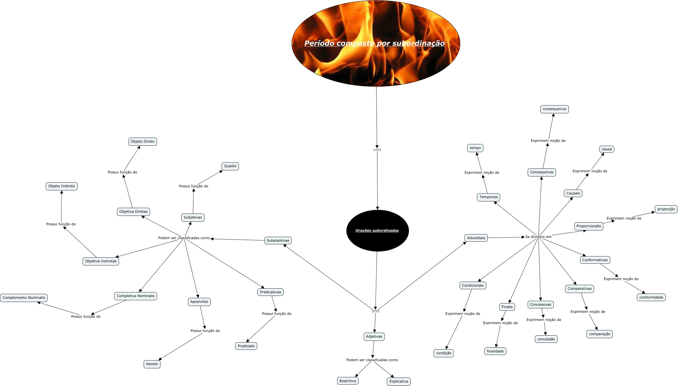Esse mapa conceitual, produzido no IHMC CmapTools, tem a informação relacionada a: Clã das chamas 18 23 24 3oB, Completiva Nominalis Possui função de Complemento Nominalis, Adverbiais Se dividem em Temporais, Adverbiais Se dividem em Comparativas, Adverbiais Se dividem em Conformativas, Adverbiais Se dividem em Consequtivas, Causais Exprimem noção de causa, Proporcionalis Exprimem noção de proporção, Adverbiais Se dividem em Causais, Adjetivas Podem ser classificadas como Restritiva, Adverbiais Se dividem em Proporcionalis, Adverbiais Se dividem em Finalis, Substantivas Podem ser classificadas como Predicativas, Conformativas Exprimem noção de conformidade, Concessivas Exprimem noção de concessão, Temporais Exprimem noção de tempo, Subjetivas Possui função de Sujeito, Substantivas Podem ser classificadas como Objetiva Indiretas, Orações subordinadas ???? Substantivas, Aposivitas Possui função de Aposto, Condicionais Exprimem noção de condição