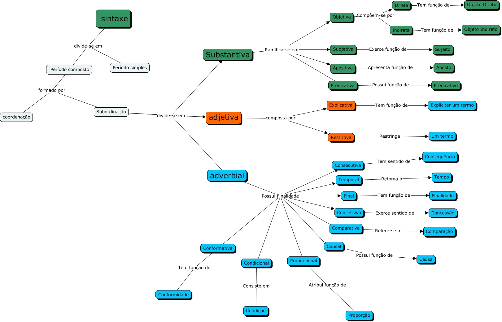 Esse mapa conceitual, produzido no IHMC CmapTools, tem a informação relacionada a: como encontrar a felicidade na sociedade contemporânea, liquida e consumista- Vitor, rafael e André 3A Oficial, adverbial Possui Finalidade Final, Proporcional Atribui função de Proporção, Subordinação divide-se em Substantiva, adverbial Possui Finalidade Conformativa, Indireta Tem função de Objeto Indireto, Condicional Consiste em Condição, Final Tem função de Finalidade, Subordinação divide-se em adverbial, Restritiva Restringe Um termo, Substantiva Ramifica-se em Apositiva, Direta Tem função de Objeto Direto, Objetiva Compôem-se por Indireta, adjetiva composta por Restritiva, adverbial Possui Finalidade Causal, Causal Possui função de Causa, Consecutiva Tem sentido de Consequência, Período composto formado por Subordinação, Subordinação divide-se em adjetiva, Subordinação divide-se em adverbial, Subordinação divide-se em Substantiva