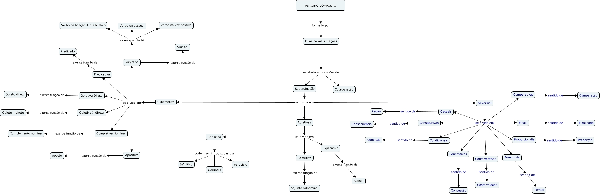 Esse mapa conceitual, produzido no IHMC CmapTools, tem a informação relacionada a: Ana B. e Lívia - 3B, Subjetiva ocorre quando há Verbo na voz passiva, Adverbial se divide em Consecutivas, Finais sentido de Finalidade, Causais sentido de Causa, Proporcionalis sentido de Proporção, Adverbial se divide em Conformativas, Adjetivas se divide em Reduzida, Duas ou mais orações estabelecem relações de Coordenação, Objetiva Direta exerce função de Objeto direto, Adjetivas se divide em Explicativa, Adverbial se divide em Finais, Substantiva se divide em Apositiva, Adverbial se divide em Causais, Condicionais sentido de Condição, Substantiva se divide em Subjetiva, Completiva Nominal exerce função de Complemento nominal, Adverbial se divide em Condicionais, Predicativa exerce função de Predicado, Subordinação se divide em Adjetivas, Restritiva exerce funçao de Adjunto Adnominal