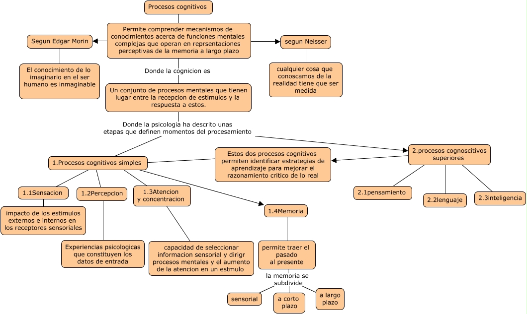 Este Cmap, tiene información relacionada con: procesos cognitivos, 1.Procesos cognitivos simples ???? 1.1Sensacion, 2.procesos cognoscitivos superiores ???? 2.3inteligencia, Permite comprender mecanismos de conocimientos acerca de funciones mentales complejas que operan en reprsentaciones perceptivas de la memoria a largo plazo ???? Segun Edgar Morin, permite traer el pasado al presente la memoria se subdivide a largo plazo, 2.procesos cognoscitivos superiores ???? 2.1pensamiento, 2.procesos cognoscitivos superiores ???? Estos dos procesos cognitivos permiten identificar estrategias de aprendizaje para mejorar el razonamiento critico de lo real, 1.1Sensacion ???? impacto de los estimulos externos e internos en los receptores sensoriales, 1.3Atencion y concentracion ???? capacidad de seleccionar informacion sensorial y dirigr procesos mentales y el aumento de la atencion en un estmulo, 1.Procesos cognitivos simples ???? 1.3Atencion y concentracion, 1.Procesos cognitivos simples ???? 1.4Memoria, Un conjunto de procesos mentales que tienen lugar entre la recepcion de estimulos y la respuesta a estos. Donde la psicologia ha descrito unas etapas que definen momentos del procesamiento 1.Procesos cognitivos simples, Un conjunto de procesos mentales que tienen lugar entre la recepcion de estimulos y la respuesta a estos. Donde la psicologia ha descrito unas etapas que definen momentos del procesamiento 2.procesos cognoscitivos superiores, 2.procesos cognoscitivos superiores ???? 2.2lenguaje, permite traer el pasado al presente la memoria se subdivide a corto plazo, Permite comprender mecanismos de conocimientos acerca de funciones mentales complejas que operan en reprsentaciones perceptivas de la memoria a largo plazo Donde la cognicion es Un conjunto de procesos mentales que tienen lugar entre la recepcion de estimulos y la respuesta a estos., 1.2Percepcion ???? Experiencias psicologicas que constituyen los datos de entrada, Procesos cognitivos ???? Permite comprender mecanismos de conocimientos acerca de funciones mentales complejas que operan en reprsentaciones perceptivas de la memoria a largo plazo, permite traer el pasado al presente la memoria se subdivide sensorial, 1.4Memoria ???? permite traer el pasado al presente, Segun Edgar Morin ???? El conocimiento de lo imaginario en el ser humano es inmaginable