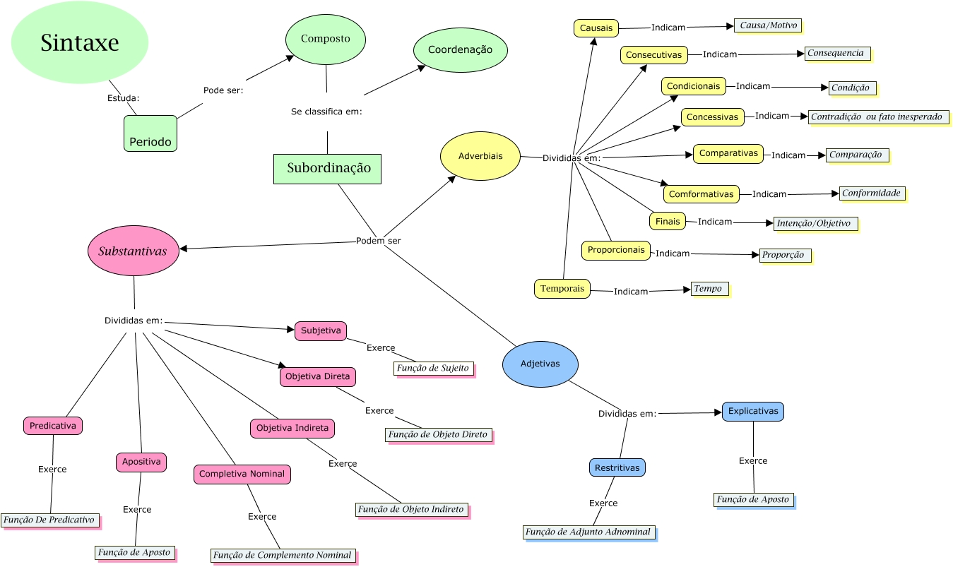 Esse mapa conceitual, produzido no IHMC CmapTools, tem a informação relacionada a: Alice e Anna Laura, Adverbiais Divididas em: Condicionais, Composto Se classifica em: Subordinação, Explicativas Exerce Função de Aposto, Adjetivas Divididas em: Explicativas, Consecutivas Indicam Consequencia, Temporais Indicam Tempo, Adverbiais Divididas em: Temporais, Condicionais Indicam Condição, Apositiva Exerce Função de Aposto, Comparativas Indicam Comparação, Objetiva Indireta Exerce Função de Objeto Indireto, Substantivas Divididas em: Apositiva, Objetiva Direta Exerce Função de Objeto Direto, Subjetiva Exerce Função de Sujeito, Adverbiais Divididas em: Comformativas, Adverbiais Divididas em: Proporcionais, Substantivas Divididas em: Objetiva Indireta, Comformativas Indicam Conformidade, Sintaxe Estuda: Periodo, Subordinação Podem ser Adjetivas