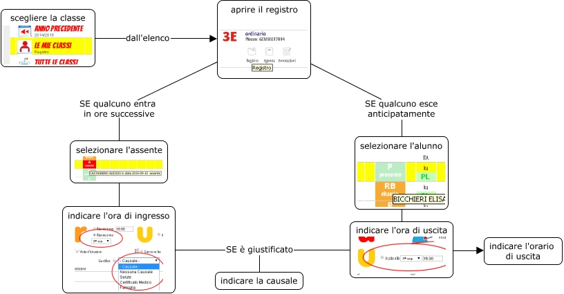 Questa Cmap, creata con IHMC CmapTools, contiene informazioni relative a: 01 Fare l'appello - Ore successive, indicare l'ora di uscita SE è giustificato indicare la causale, indicare l'ora di ingresso SE è giustificato indicare la causale, selezionare l'alunno indicare l'ora di uscita, scegliere la classe dall'elenco aprire il registro, indicare l'ora di uscita indicare l'orario di uscita, aprire il registro SE qualcuno esce anticipatamente selezionare l'alunno, aprire il registro SE qualcuno entra in ore successive selezionare l'assente, selezionare l'assente indicare l'ora di ingresso
